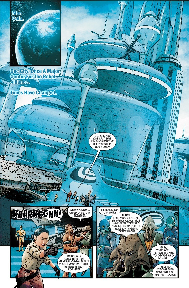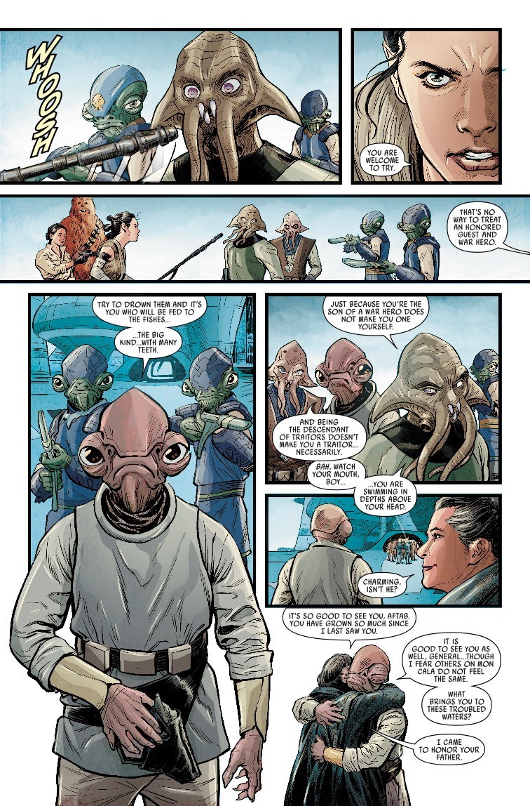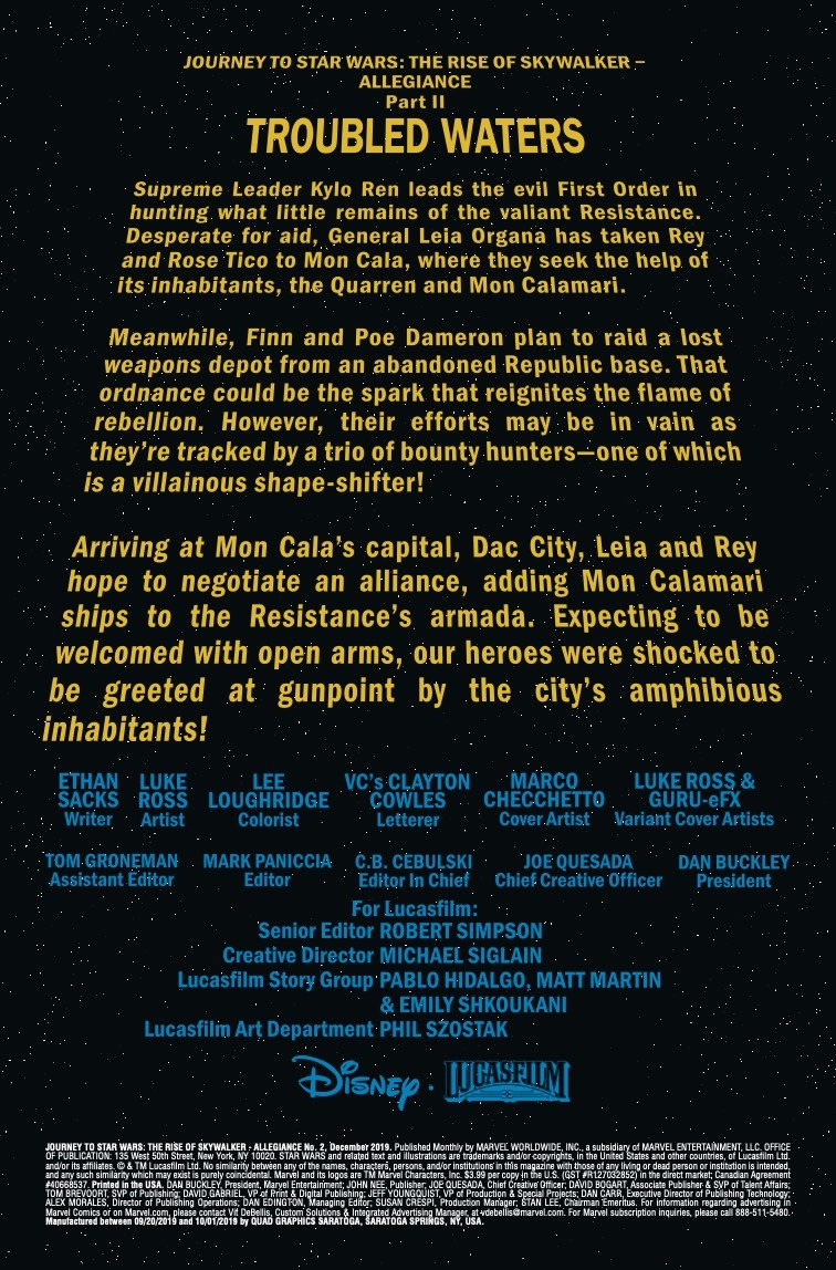 BEFORE THE EXCITING EVENTS OF STAR WARS: THE RISE OF SKYWALKER! Hounded by the FIRST ORDER across the galaxy, the RESISTANCE is in dire need of ships, weapons and recruits to make a final stand against KYLO REN’S forces. Desperation drives a delegation led by GENERAL LEIA ORGANA and REY to entreat the Rebel veteran’s one-time allies, THE MON CALAMARI, to join the fight.