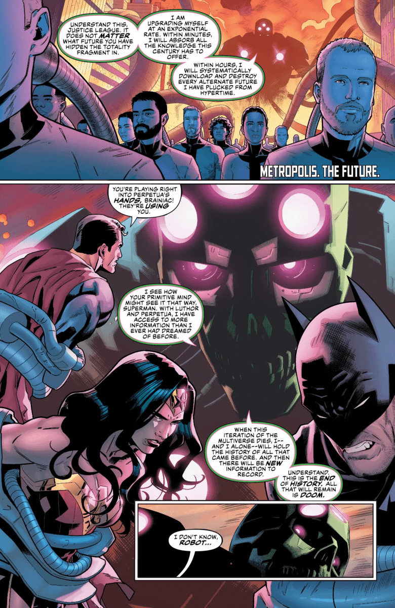 “The Justice Doom War” part five! All Hypertime is breaking! If it blows, all of reality will follow after-which would be just fine for Lex Luthor, who is ready to prove to the evil goddess Perpetua that he’s the bad man for her. The Justice League is attempting to do what they can, chasing the Legion of Doom across the time-sphere. If the Totality is put back together, the whole Multiverse will tip toward Doom…and have consequences that reverberate throughout the DC Universe-assuming it’s not destroyed in the process.