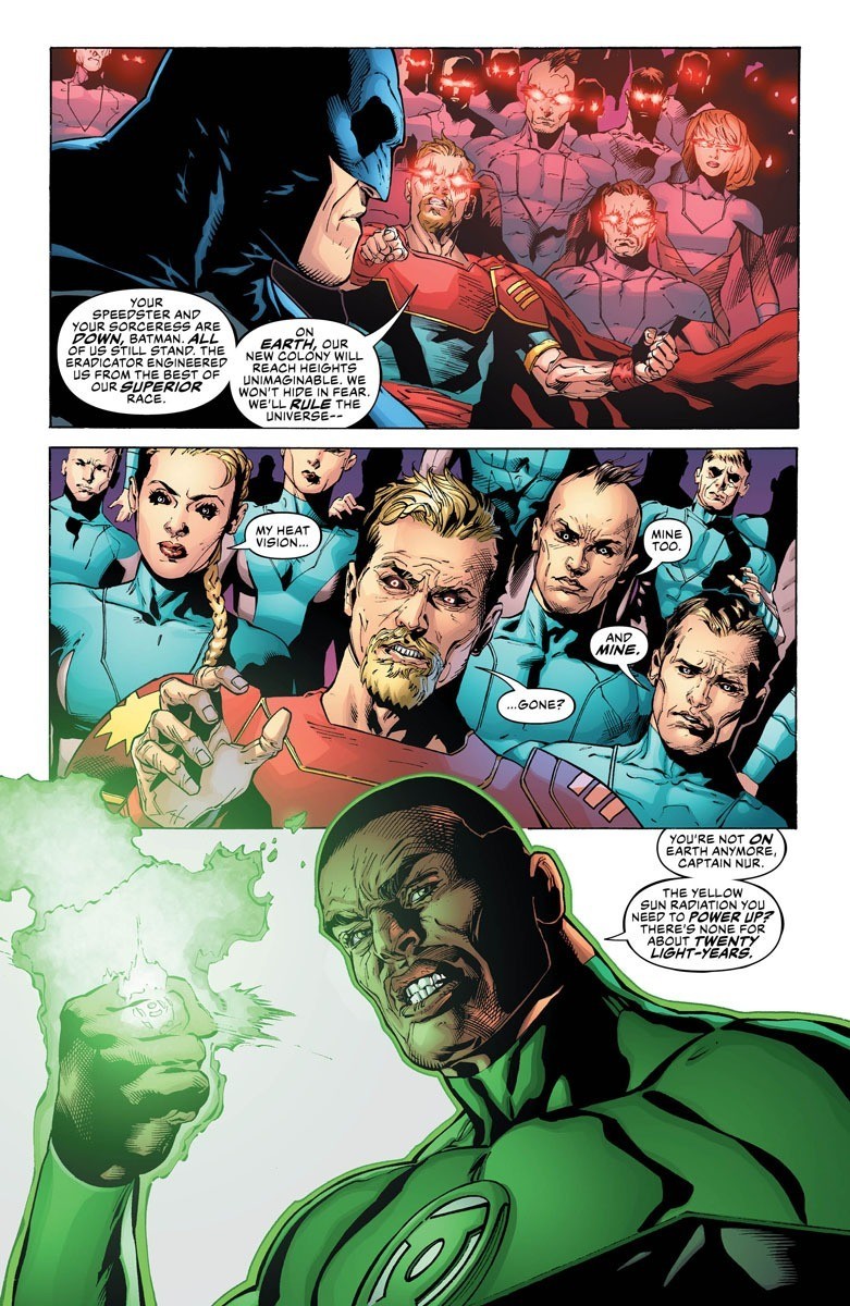 All secrets revealed! Caught in the Justice League’s trap, the Eradicator reveals the truth hidden in his circuits. And as Superman confronts his past defeat, it’s up to Wonder Woman to make a decision that will divide the team. The no-holds-barred war between the League and a murder machine with Superman’s face concludes!