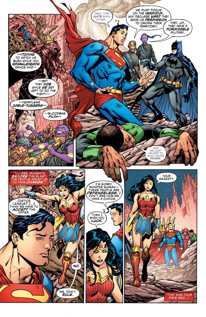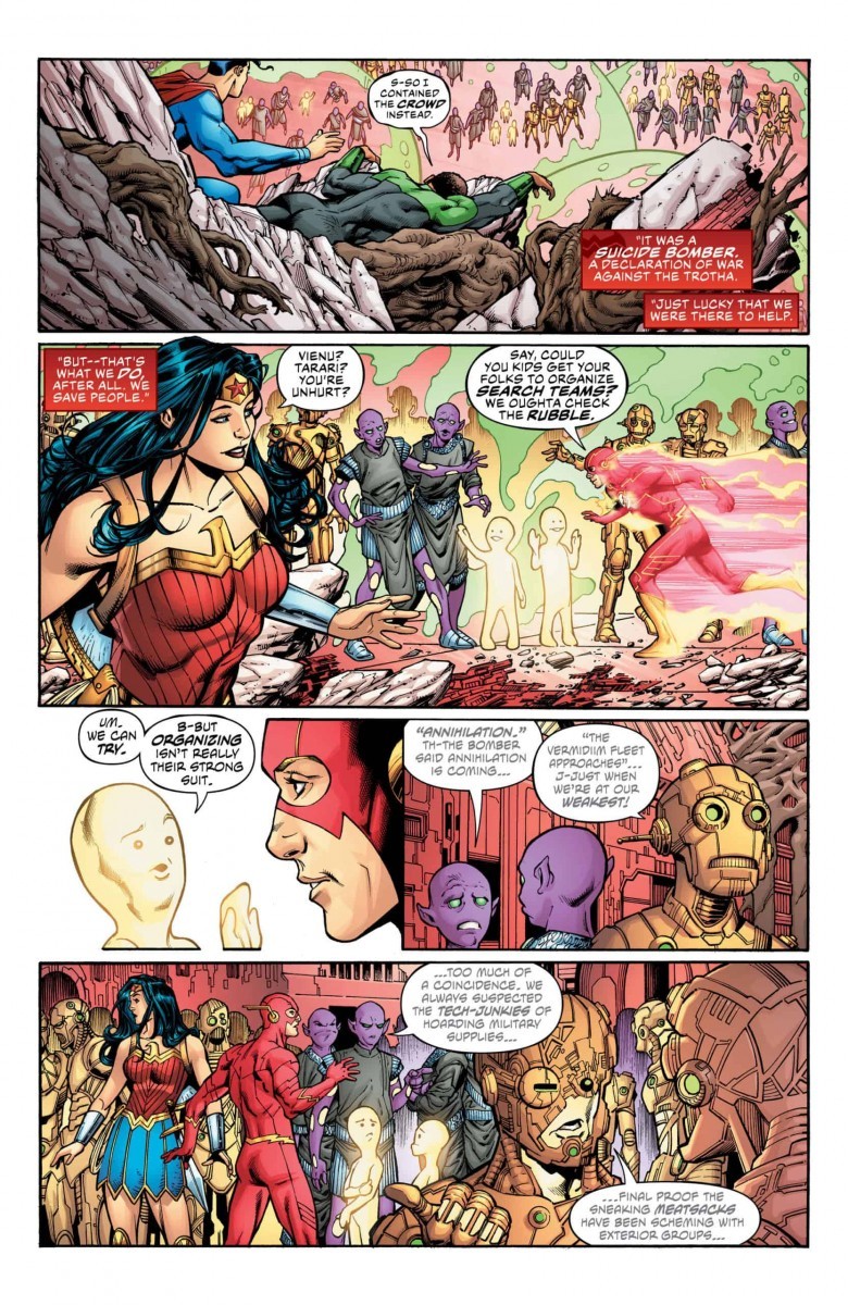 “The Rule of War” part two! After the devastating events of last issue, the League is separated and labeled as alien visitors on a war-torn planet. With events spiraling out of control, and no leader to guide planet Trotha’s citizens, how can the League save this world without interfering? As the team battles rogue factions, Batman makes a startling discovery that will threaten any hope the team has of returning home!