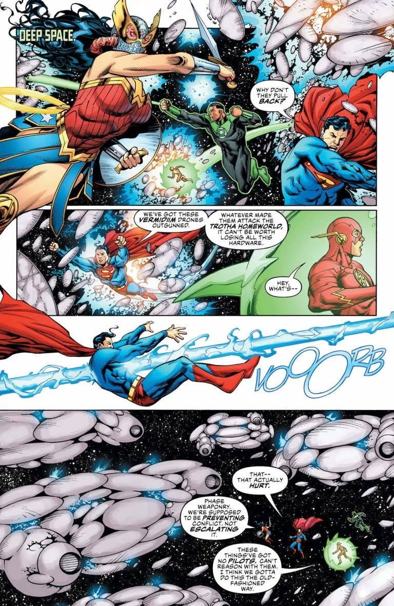 Special extra-size anniversary issue! It’s the final chapter of “The Rule of War”-and all the rules are broken! On the alien planet Trotha, Empress Siddinx’s plan is revealed, and it’s nothing short of world domination-with the Justice League entangled in her puppet strings. But how can the team save a population that now hates and fears them?
