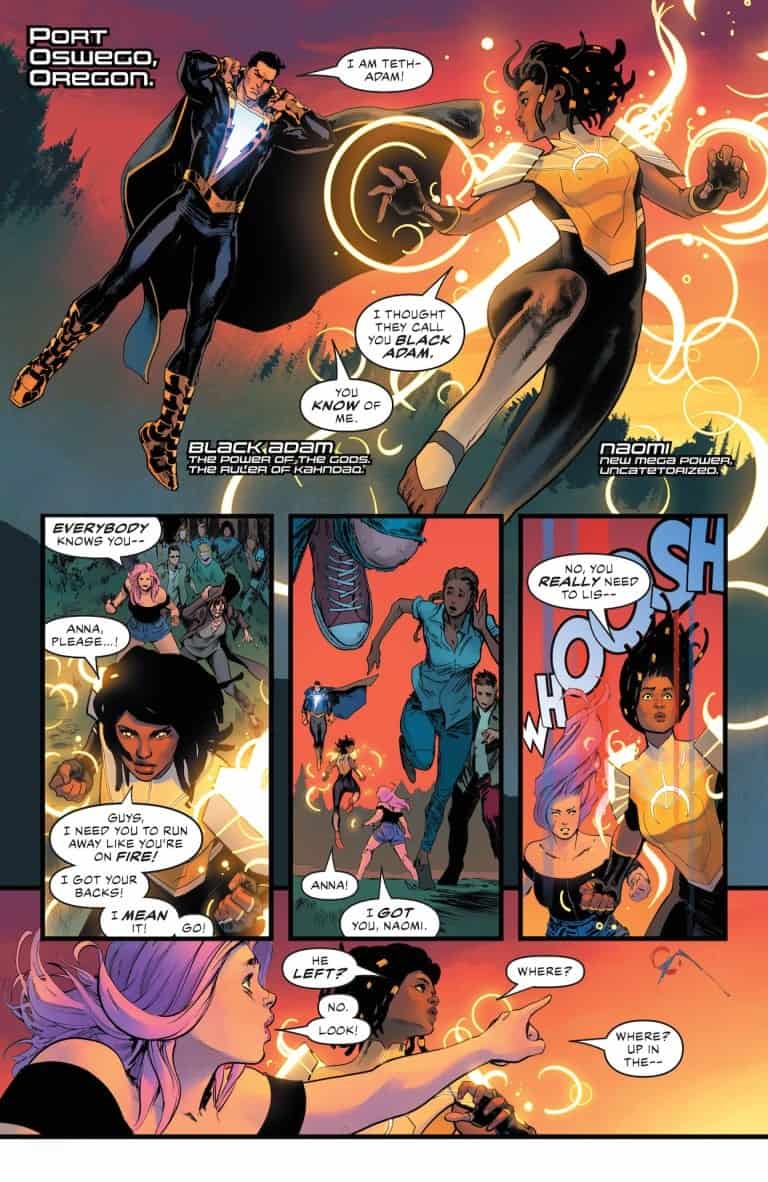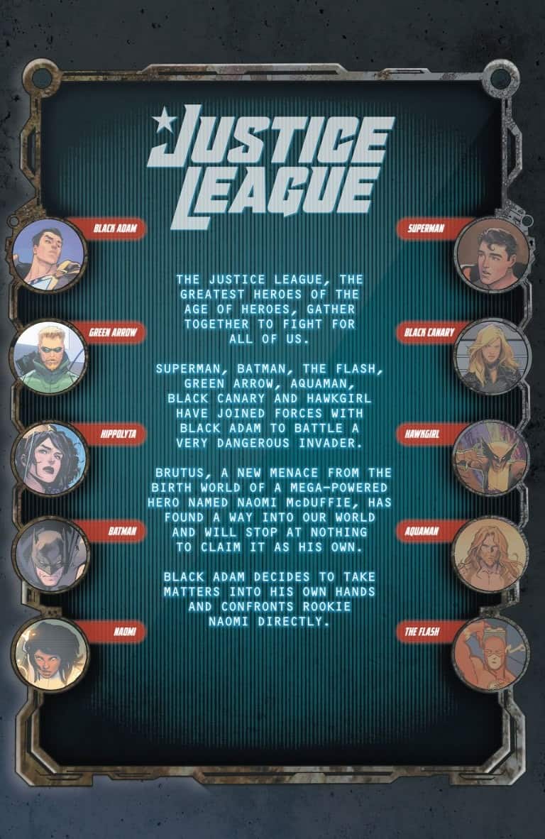 Superman, Batman, Green Arrow, Black Canary, Aquaman, and Hawkgirl join forces with Black Adam to fight an all-new world conqueror! But how do they stop the unstoppable power known as Brutus? Enter new mega-power sensation Naomi, who comes face to face with the League and brings along Queen Hippolyta of the Amazons for a blockbuster battle for the ages-with a last-page cliffhanger that will leave everyone guessing what’s next!