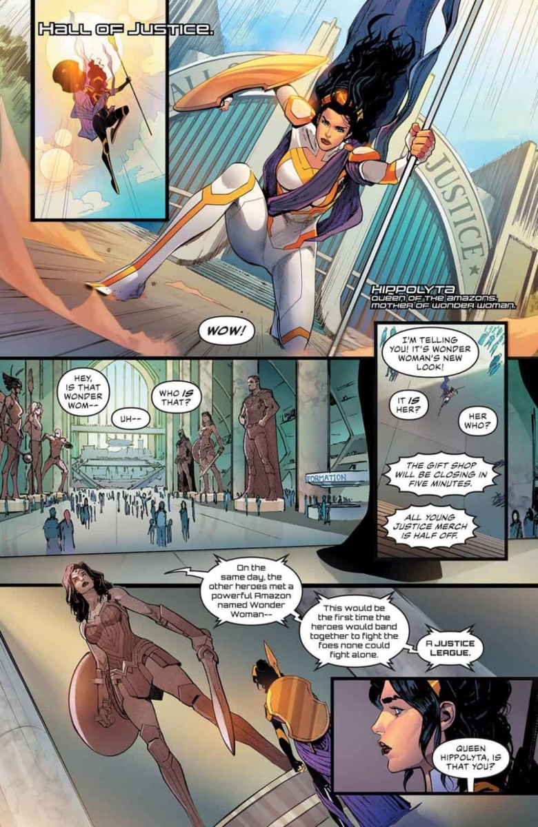 The Justice League! The biggest heroes! The biggest threats! With their powers out of control and trapped on a world they do not understand, the League must band together like never before. Queen Hippolyta is forced to confront her new destiny. All this and a last page so shocking that it will have fans of Naomi screaming! Meanwhile, in our bonus story, the Justice League Dark are trapped in the Library of Babel, where they are learning the hard way that the pen is mightier than their swords. Elsewhere, Merlin sets his sights on a lost city that hides the key to his violent delights. Could this mean a violent end for all?