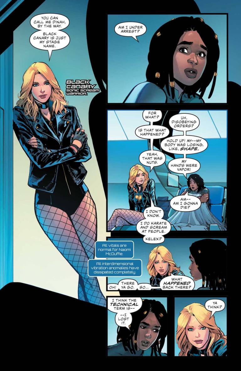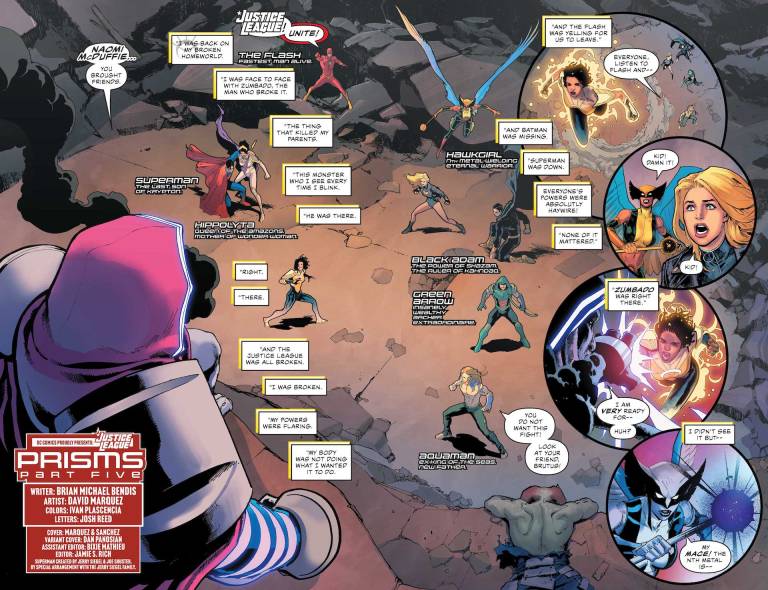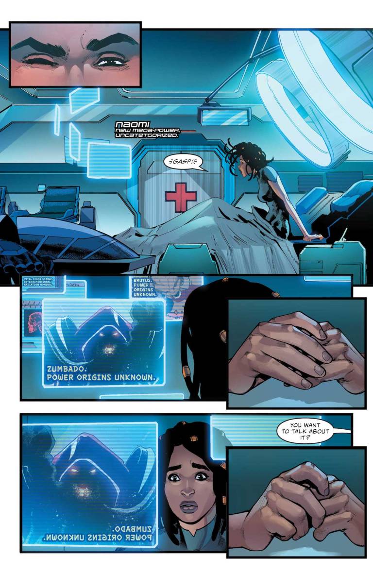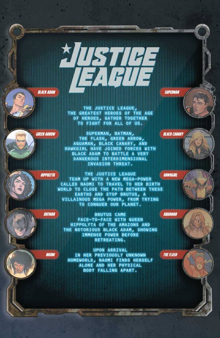 The Trial of Naomi commences! After the shocking events of the last few issues of Justice League, the team is forced to confront its larger issues as a group and the responsibilities the League has to the world where they live versus the Multiverse at large. Guest stars galore as Justice League members from the past come to give guidance for the future. Naomi’s fate is revealed. Black Adam joining the Justice League becomes public, and the fallout is surprising. And what cosmic secret is Hawkgirl carrying with her?