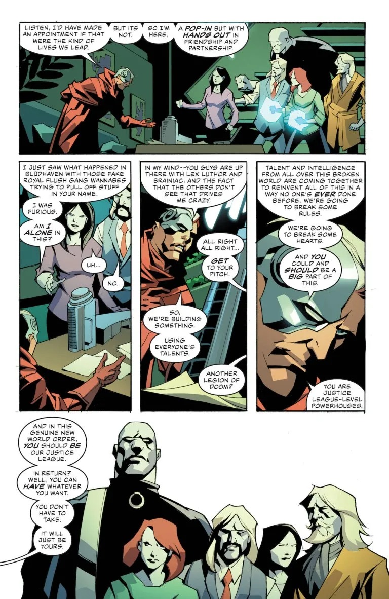 Place your bets, folks! The Royal Flush Gang is BACK and ready to take down the Justice League! Find out their connection to Deathstroke and their growing plot to destroy Green Arrow and Batman. Meanwhile, a villain from the Dark Multiverse has returned and he’s about to turn the Justice League Dark’s world upside down! Could this be the end of their team AND Atlantis?