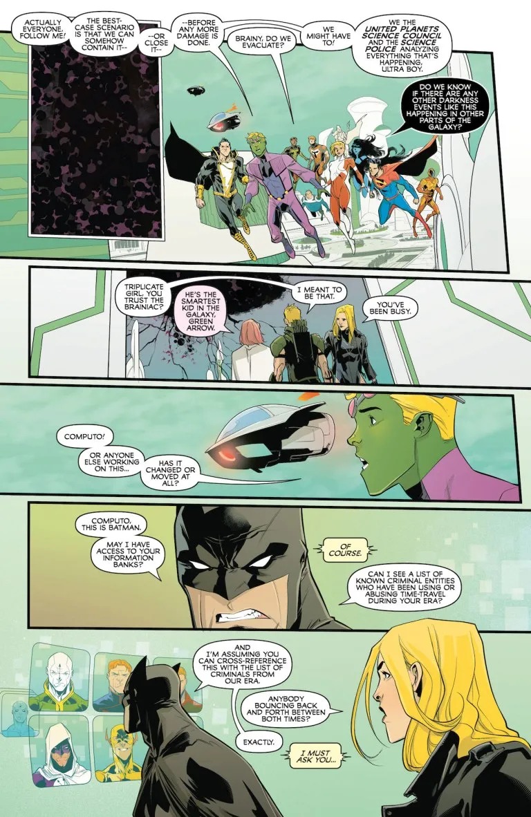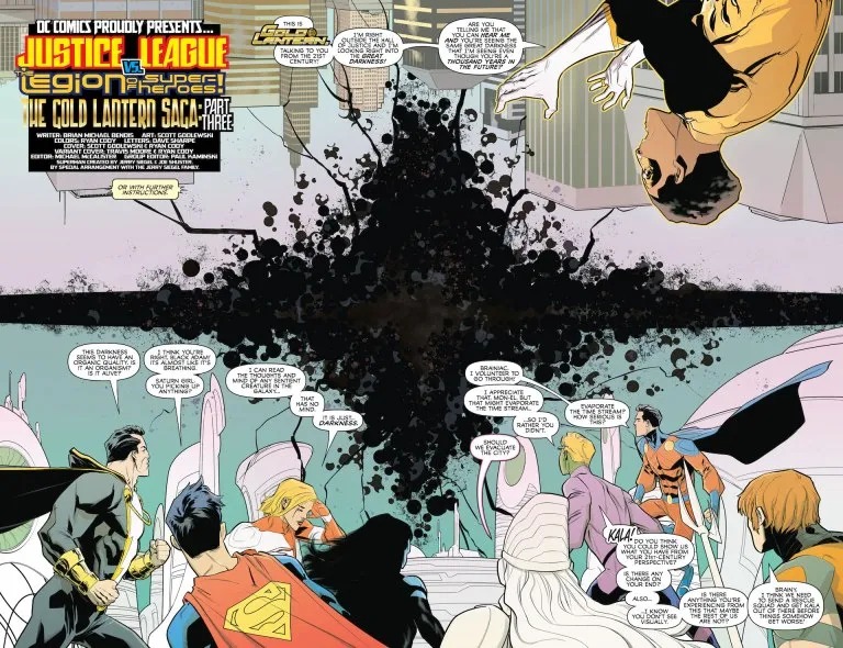 The Justice League is trapped in the 31st century with the Legion of Super-Heroes, while the looming terror of the Great Darkness hovers over both time period simultaneously. Even as the great heroes of the 21st century get to experience the fantastic far-flung future, the mysteries behind the Gold Lantern and the Great Darkness threaten all of existence. What is the secret behind the Great Darkness? And will the greatest heroes of two ages be able to stop it before it’s too late?