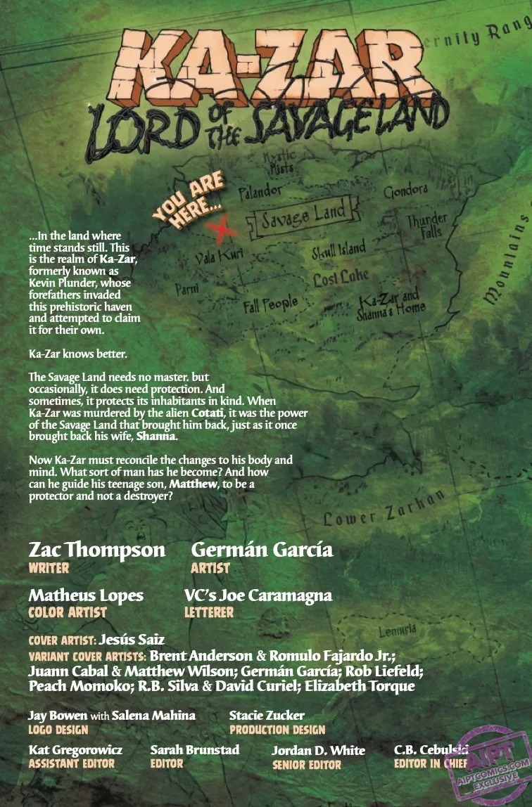 The alien Cotati murdered him. The Savage Land brought him back. Lord Plunder has returned — with a vastly new perspective! Now united with Shanna the She-Devil in a mystical merging of life energies, Ka-Zar has new abilities, new needs…and new enemies. An ancient evil has surfaced in the Savage Land — one that is rapidly reshaping the forgotten world and its inhabitants. Ka-Zar and Shanna must fight together to protect their home and family! But their son Matthew has plans of his own… Don’t miss this spectacular adventure through the lost lands by Zac Thompson and Germán García!