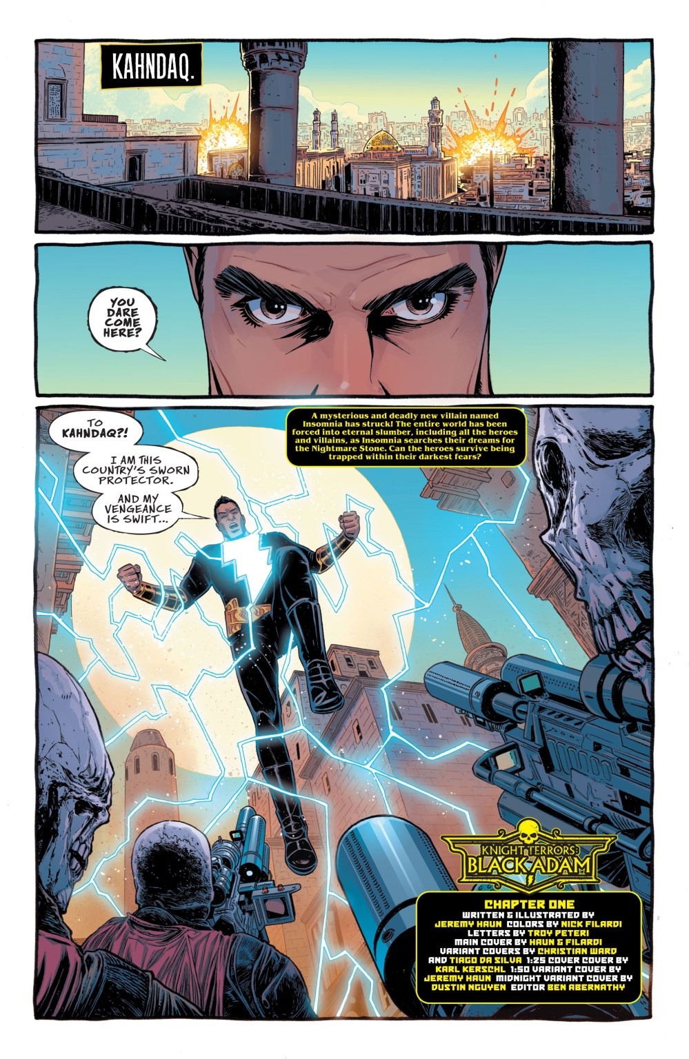 Black Adam is defending Kahndaq from a border assault when the deadly nightmare wave sweeps the planet, putting all men, women, and children into the nightmare realm…including the fierce monarch! But what are his deepest, darkest nightmares? What horror can put fear into the heart of Black Adam?! Knight Terrors begins!