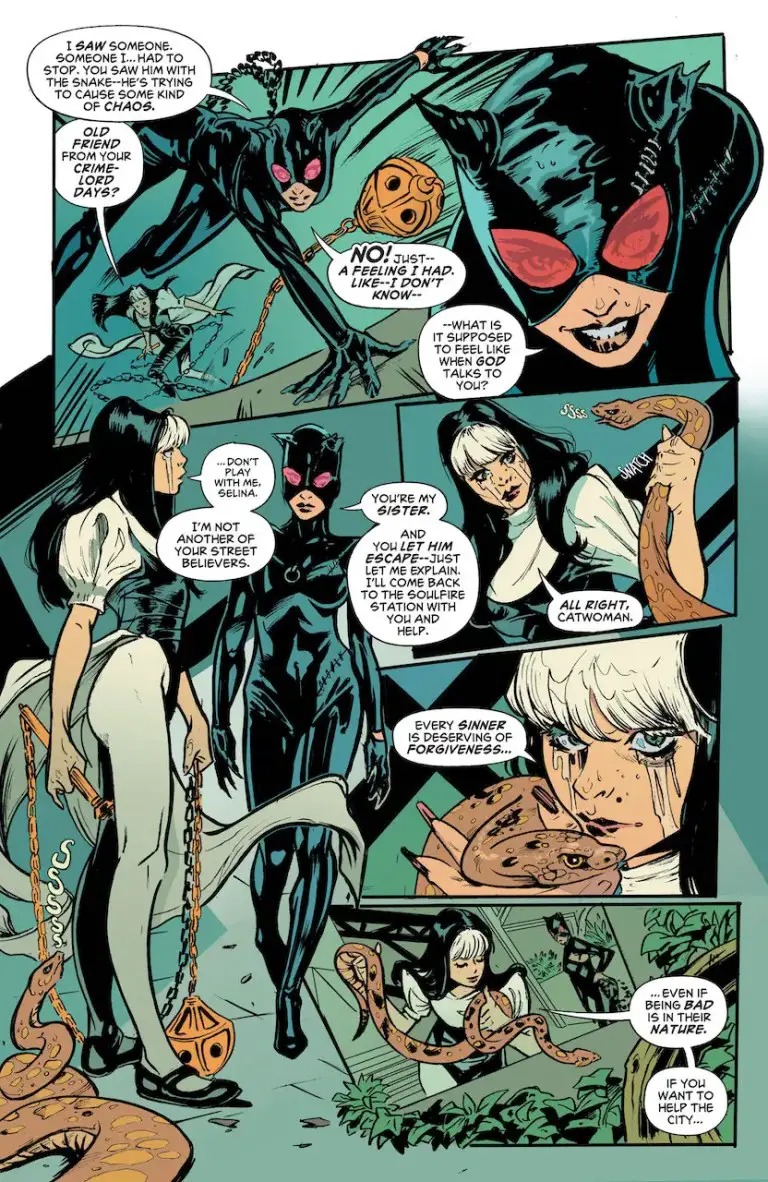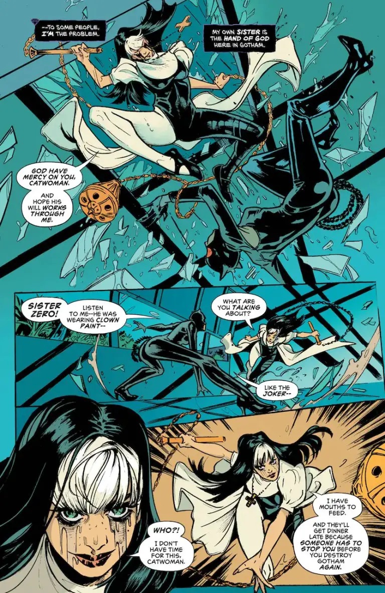 Forgive me, sister, for I have sinned. I murdered Valmont, the man I love, in order to save the man I loved…Batman…who will never forgive me for breaking his one rule. But please forgive me, Sister Zero, for this Nightmare Realm you’ve put me in as penance–from which I can’t seem to wake up–is my Catholic guilt come to life in the form of your rotting disciples taking my soul. Sister Maggie, if you’re still somewhere in there, forgive me, and let me save us in the Nightmare Realm in order to save us in real life! That is…unless we should die before we wake.