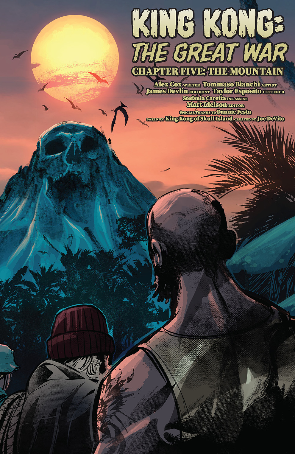 From the fevered pen of ALEX COX and the master brush of TOMMASO BIANCHI comes a haunting tale of gore and ape-shaped death! In this issue, our heroes finally reach the safety of high ground as they scale the deadly island’s skull-shaped mountain. Safe from Kong (for the moment!), they can see human civilization in the distance. But will the cave in which they have taken refuge prove to be a sanctuary — or a mortuary?!?