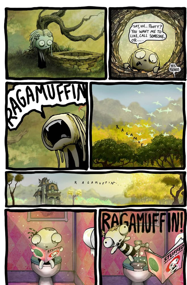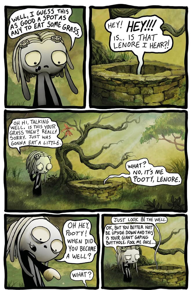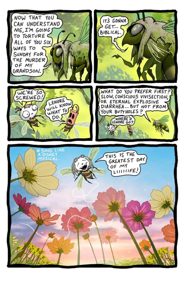 One day in the deep dark forest, whilst out on a lovely walk, looking from some green grass to eat, Lenore and Ragamuffin find their chum Pooty at the bottom of a well. Turns out he’s been beaten up and thrown down there by a real dick of a bee. Things take a turn for the worse when the bee thug comes back and proceeds to beat the living crap out of them all leading to a veritable fight to the death! Then the bee’s Gram Gram, the legendary BEEBEEYAGA, turns up and all hells breaks loose! Mondays, am I right?
