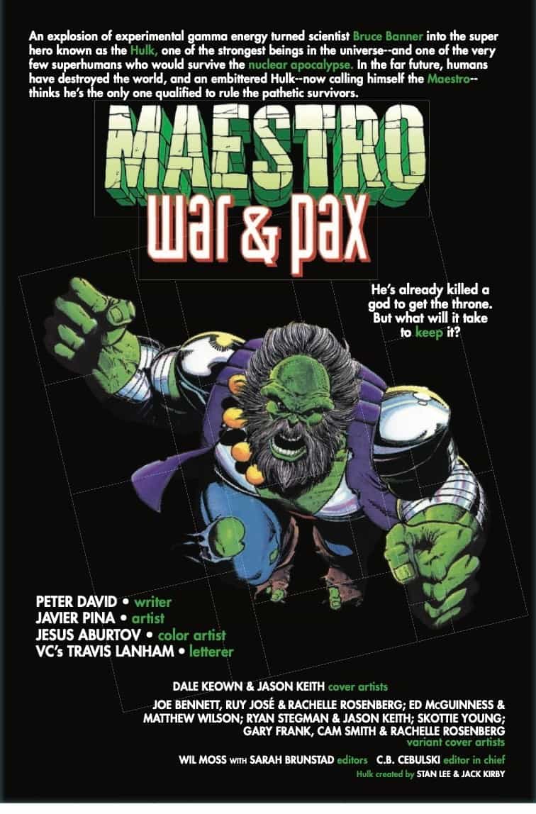 PETER DAVID AND THE MAESTRO RETURN IN A BRAND-NEW SERIES! The man once known as the Hulk is now neither man, nor Hulk — call him only THE MAESTRO! After deposing Dystopia’s ancient ruler, the Maestro sets his sights even bigger. It’s time the entire planet Earth recognized their one true god! But the Maestro isn’t the only immortal left…and if he wants to truly dominate the planet, he’ll have to face the most powerful beings in creation! PETER DAVID continues the tale that began decades ago in the legendary Future Imperfect!
