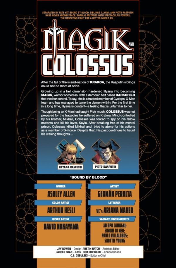 THE MUTANT SIBLINGS REUNITE! Illyana Rasputin is a cynical sorceress with power harnessed from the dark realm of Limbo. Piotr Rasputin is made of metal, but with a heart much softer than his exterior. But despite being family, blood does not run thicker than water! When they return to their mother country, they discover ancient monsters from Russian folklore preying on the innocent! Can these two mutant siblings set aside their differences to save their country? The talented creative team of MAGIK, Ashley Allen and Germán Peralta, reunite for an X-Men story full of epic fights, mysticism and family drama!