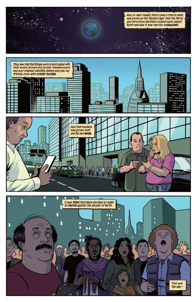 She is the red-haired She-Devil with the Sword. They are the green-skinned invaders from the red planet. Yes, those dastardly Mars Attacks Martians are attacking again, and these are the Martians of old, the Martians of the Hyborian Age. And so, it’s up to Red Sonja to stop the attack. But how will steel and strength and savagery stand again laser guns, sci-fi technology and weird, weird Martian science? Only one way to find out! Buy this freakin’ book!