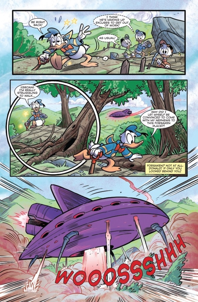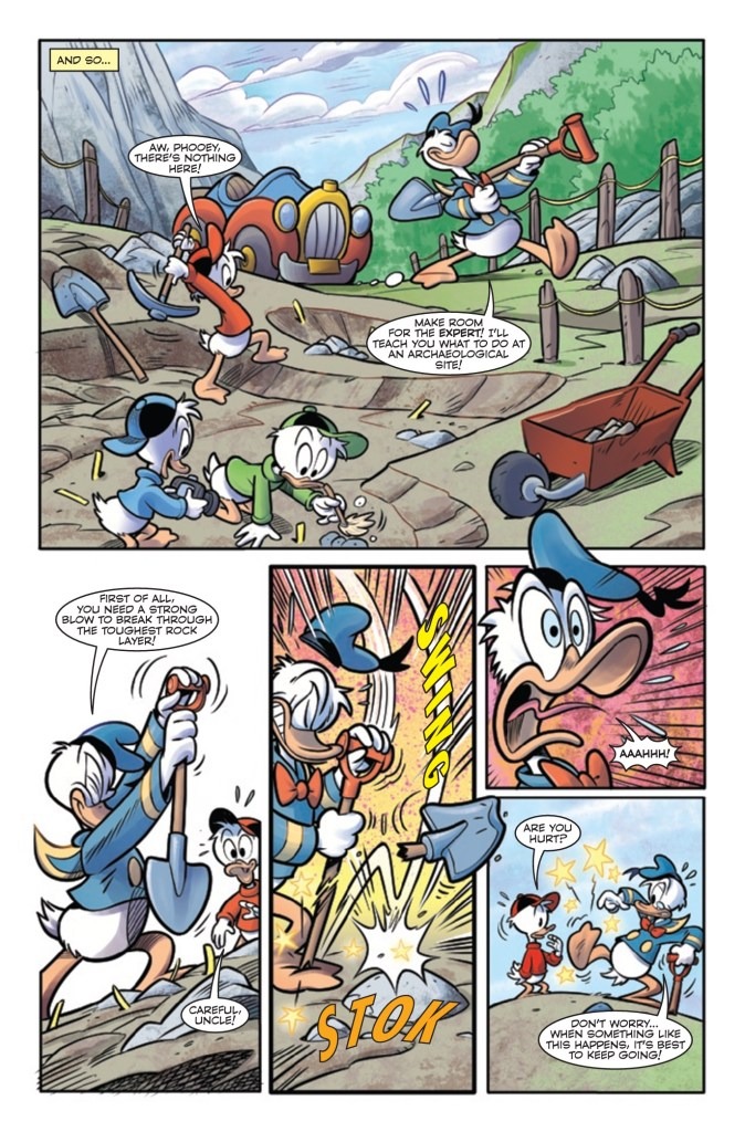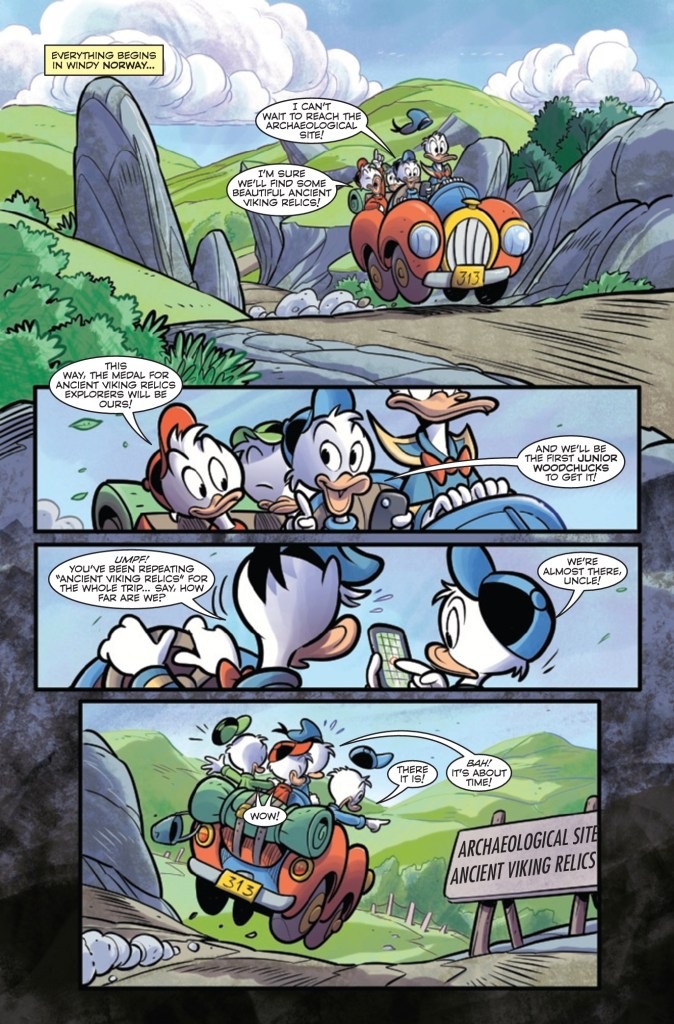 IS THIS FOWL WORTHY OF THE HAMMER OF THOR?! When DONALD DUCK chaperones HUEY, DEWEY AND LOUIE on an archaeological trip to search for ancient Viking artifacts, he finds more than he bargained for when he comes across the STONE DUCKS FROM SATURN preparing for an invasion. But everything changes when he discovers an enchanted cane that causes an egg-ceptional transformation, gifting him with the POWER OF THOR! Can he learn how to use his new abilities in time to save DUCKBURG before he changes back? Find out in this mind-twisting retelling of THE MIGHTY THOR’S THUNDEROUS ORIGIN!
