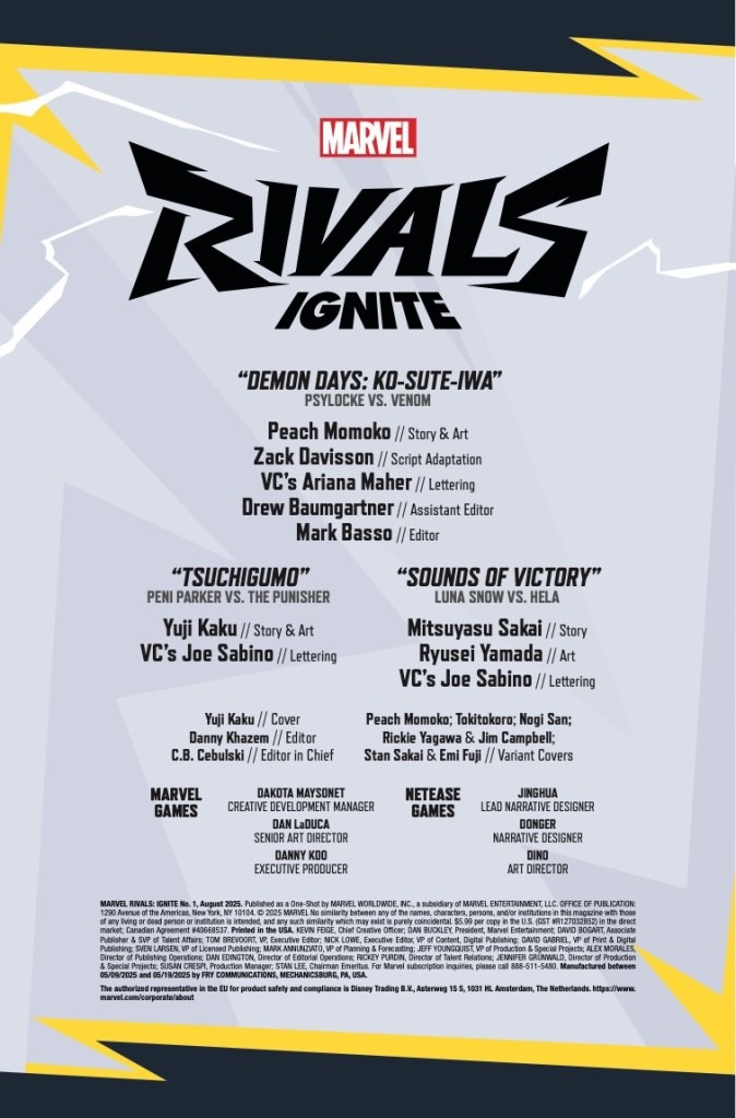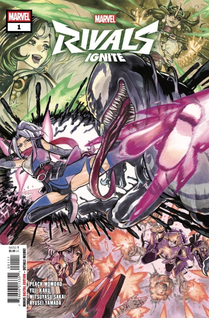 Marvel Rivals tacks our heroes back in time — and to Japan — for all-new adventures! Hot off the debut of Marvel Rivals, Peach Momoko designed a wave of costumes bringing the Marvel Heroes to Japan! First: Sai takes on the symbiotic chaos of Venom! Yuji Kaku brings Frank Castle — the unbeatable Punisher — face-to-face with… Peni Parker?! Where Peni is, SP//dr isn’t far behind… Plus: K-Pop star Luna Snow is brought to the depths of Hel/Asgard and right into the hands of Hela!
