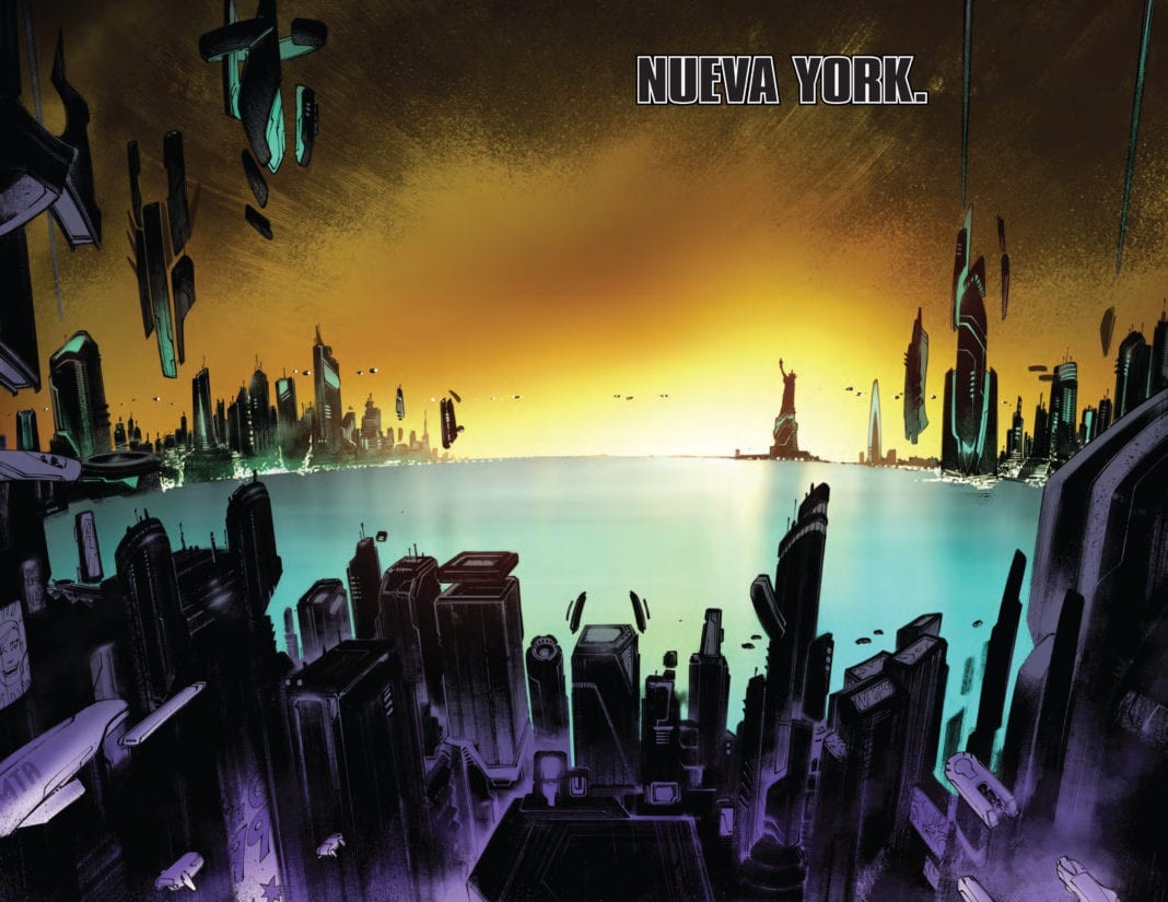 80 years ago, the Marvel Universe was born. 80 years from now, will it die?! THE FUTURE IS IN PERIL! Events of AMAZING SPIDER-MAN have been leading to this for months. Something is happening in 2099 that spans Nueva York and beyond and will shake up the official Marvel Future forever. This is not a drill!