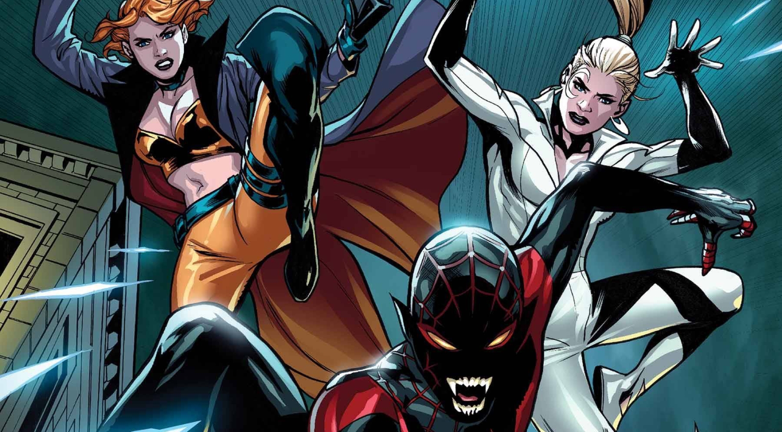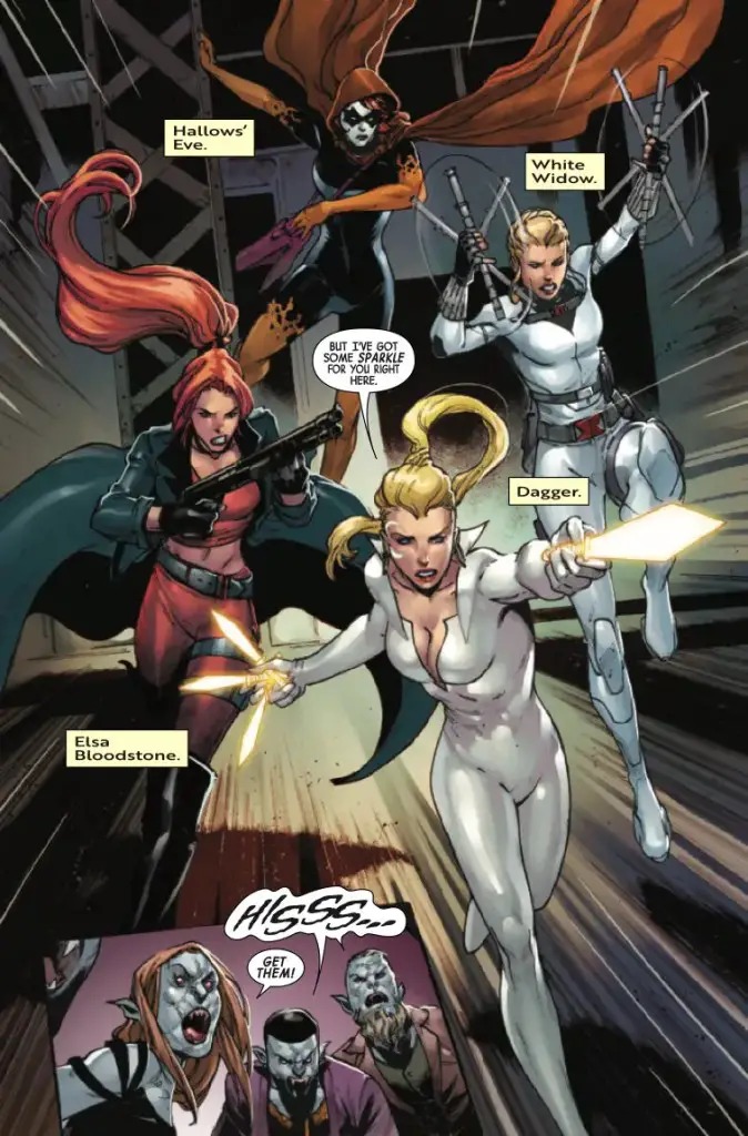 DAGGER! ELSA BLOODSTONE! WHITE WIDOW! HALLOWS’ EVE! Marvel’s newest team takes to the streets to clean up the aftermath of BLOOD HUNT — namely, hunting down the remaining vampires who threaten to spill innocent blood! Including the deadly super-vamps of the BLOODCOVEN! But when MILES MORALES, A.K.A. SPIDER-MAN, gets caught in the crosshairs… need we say it?! THERE WILL BE BLOOD! Don’t miss the beginning of an epic new adventure!