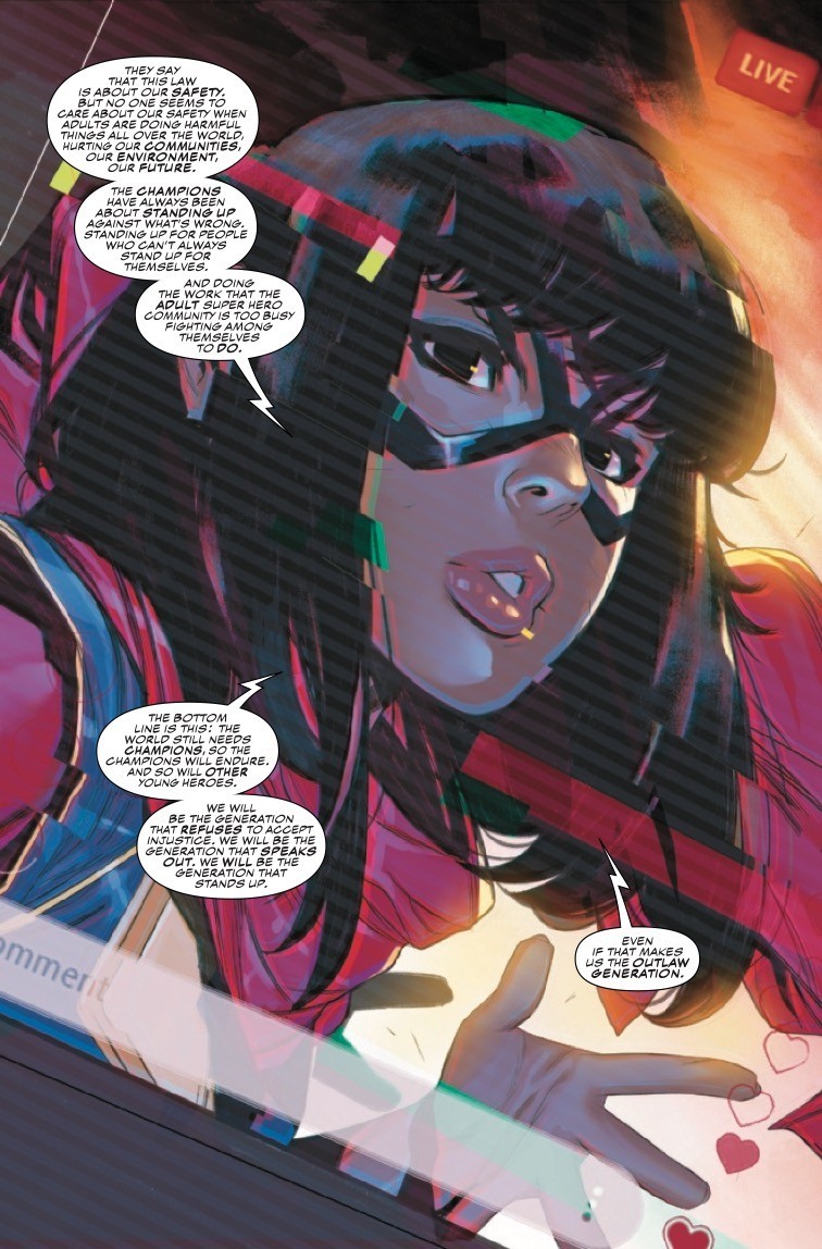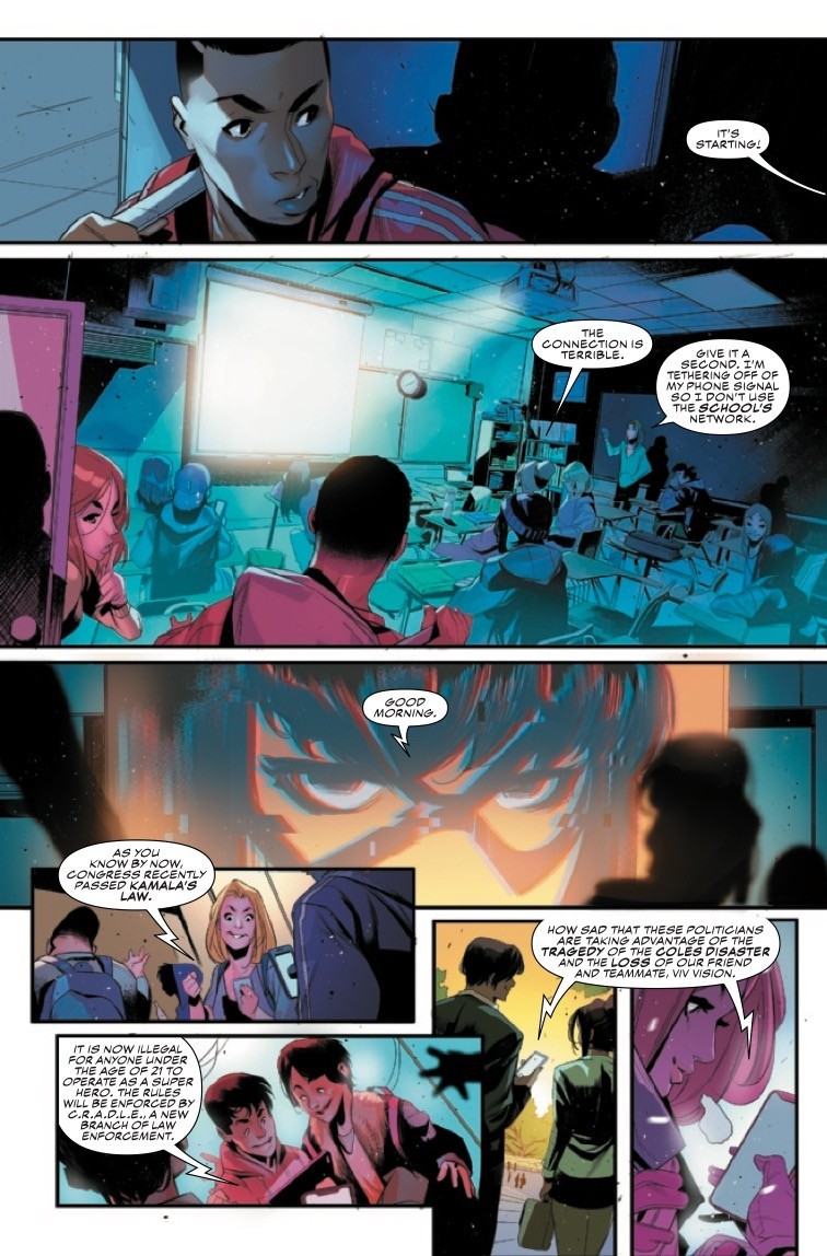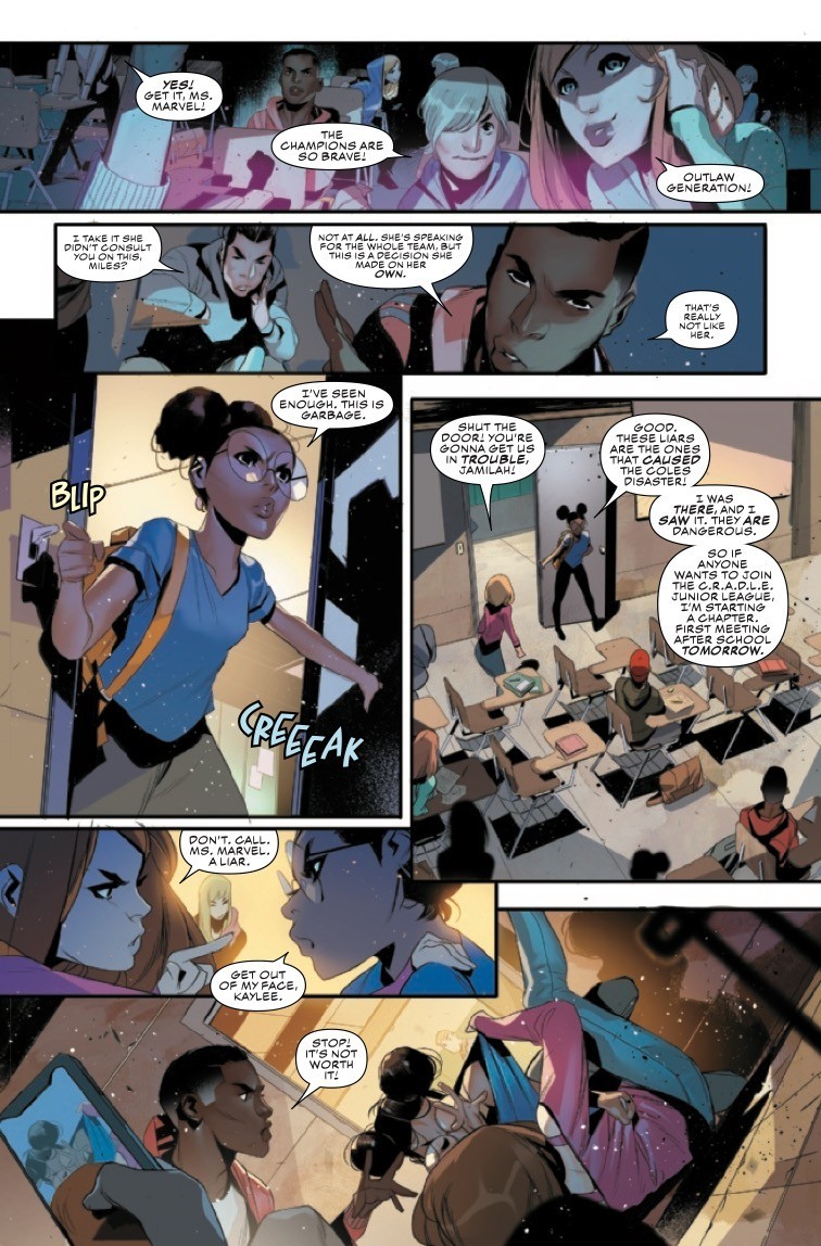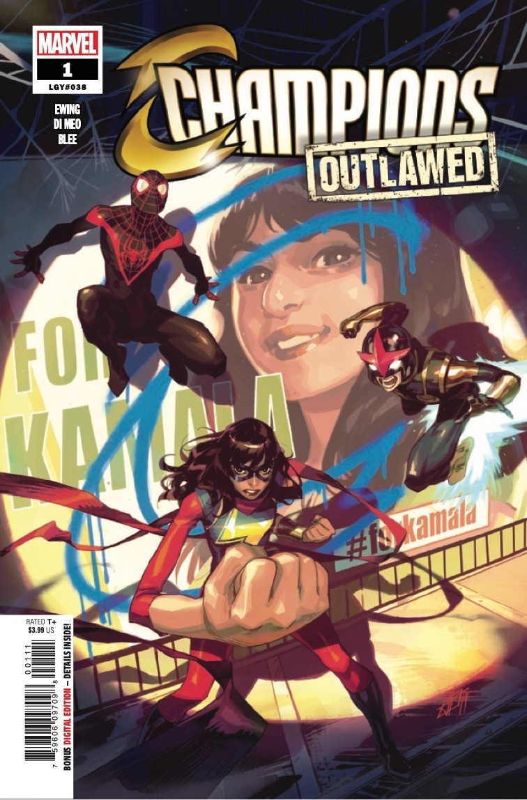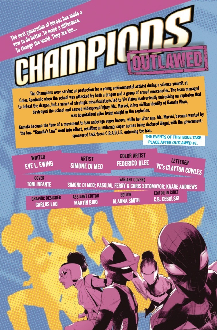 THE CHAMPIONS RETURN IN TROUBLED TIMES! A law is passed that goes against everything Ms. Marvel, Nova and Spider-Man founded the Champions for-But the world still needs heroes, even if the world doesn’t want them right now. After Ms. Marvel makes an unexpected and emotional announcement that her team won’t go down without a fight, a group of teen vigilantes gathers to plan their next move. But the C.R.A.D.L.E. task force is hot on their trail, and there’s a spy in their midst. Eve L. Ewing (IRONHEART, OUTLAWED) and Simone Di Meo (IMMORTAL HULK: THE BEST DEFENSE and VENOM: ACTS OF EVIL) team up for a dramatic new era of Champions that will define Marvel’s teen heroes for years to come!