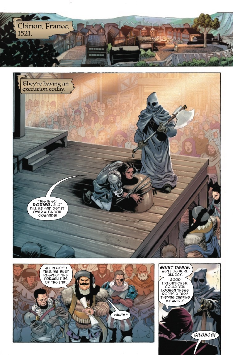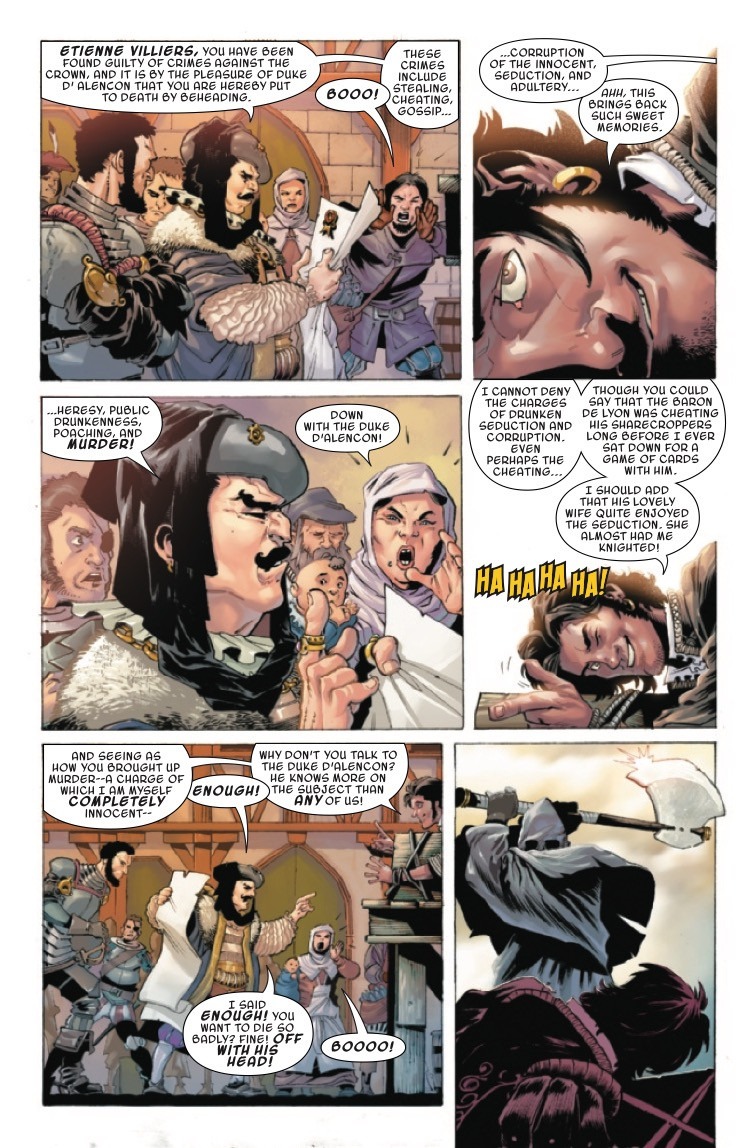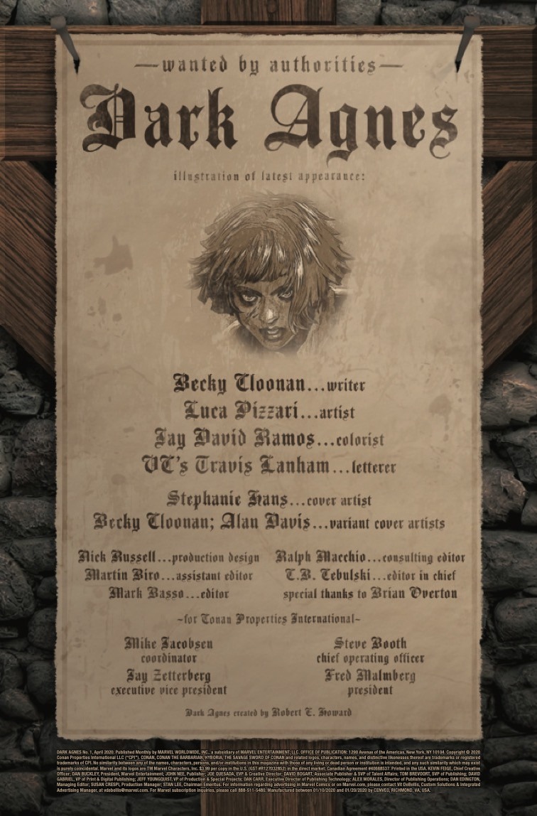ROBERT E. HOWARD’S SWORDSWOMAN IN HER FIRST SOLO COMIC SERIES! Forced into an arranged marriage, Agnes de Chastillon took matters into her own violent hands to free herself from the yoke of a life she never wanted. Now, the woman known as DARK AGNES, along with her mercenary partner ETIENNE VILLIERS, make their way through 16th century France as sellswords on their way to join the wars in Italy, where the real money is! But when Etienne is captured by the DUKE OF ALENCON’s forces and set for execution, it’s up to Dark Agnes to save the day! But what evil designs are being enacted on Agnes, and will she doom herself by saving Etienne? An all-new story following up Robert E. Howard’s tales, the swashbuckling saga of DARK AGNES in Marvel Comics starts here!