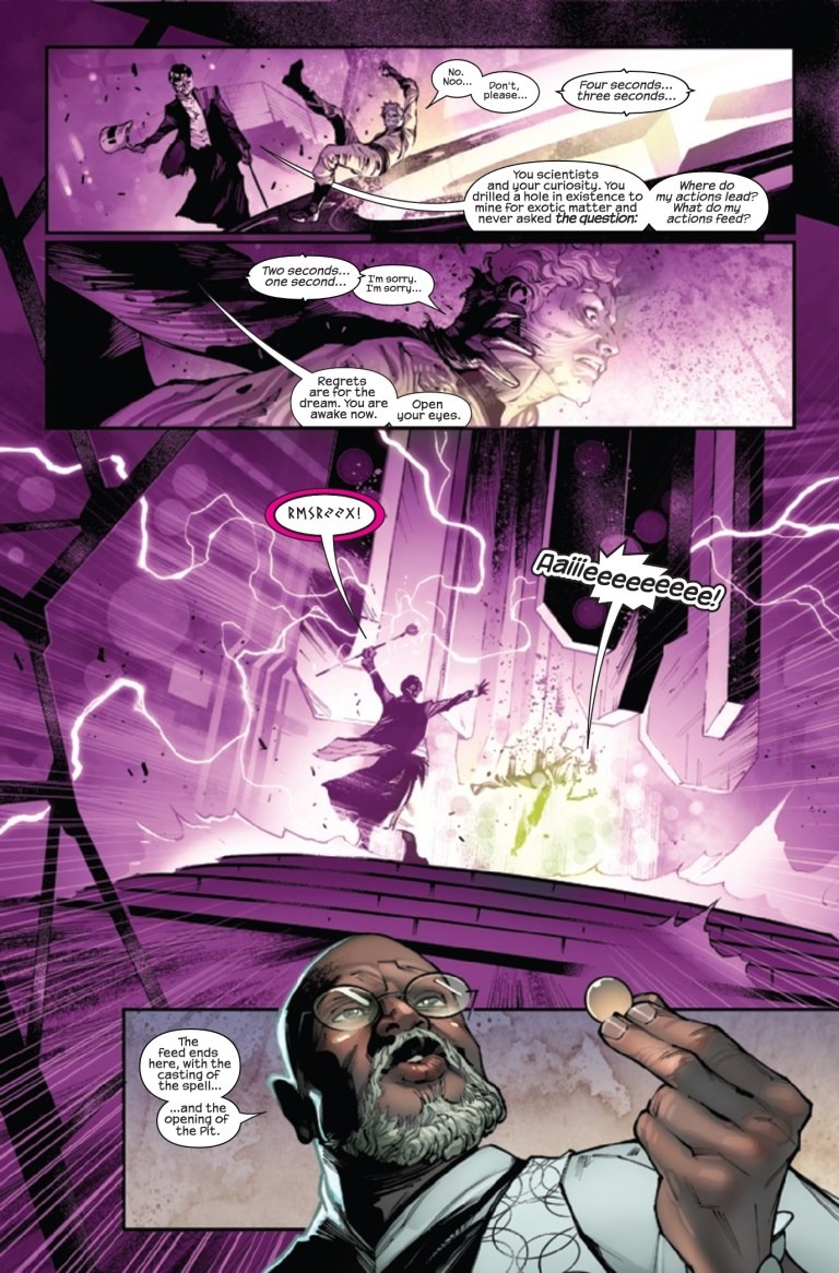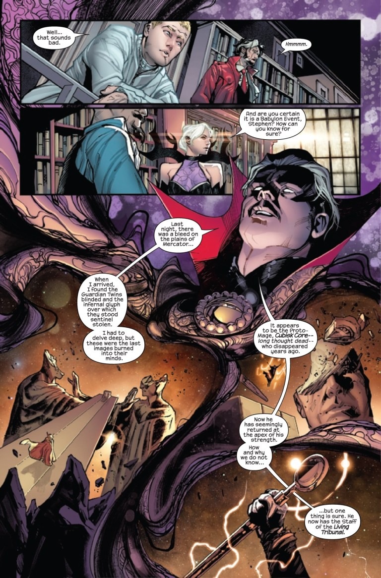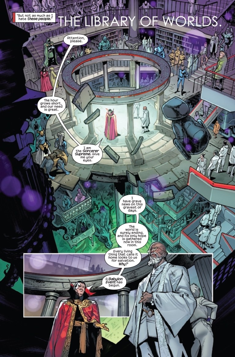 JONATHAN HICKMAN RE-INVENTS THE COSMOLOGY OF THE MARVEL UNIVERSE! WHAT HAPPENS WHEN THE-POWERS-THAT-BE MEET THE-NATURAL-ORDER-OF-THINGS? The infinite détente between THE-NATURAL-ORDER-OF-THINGS and THE-POWERS-THAT-BE nears an end. Old acquaintances are reunited during a Babylon Event. The Lion of Wolves throws the worst parties. Don’t look under the table. There’s a John Wilkes Booth penny on the ground. This ENORMOUS EXTRA-SIZED first issue features DOCTOR STRANGE, who, while not boring at all, is easily the most boring person in the book.