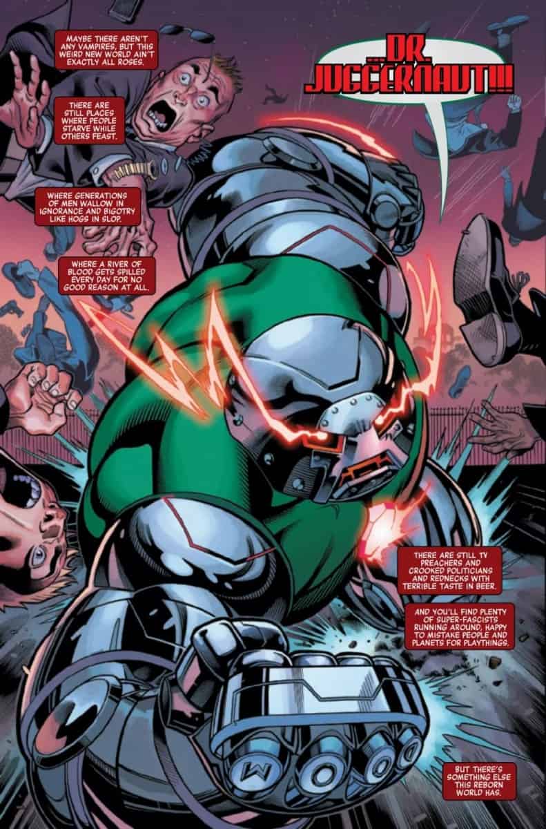 A WORLD WITHOUT AVENGERS! Welcome to a world where Tony Stark never built an Iron Man armor. Where Thor is a hard-drinking atheist who despises hammers. Where Wakanda is dismissed as a myth. And where Captain America was never found in the ice because there were no Avengers to find him. Instead this world has always been protected by Earth’s Mightiest Heroes, the Squadron Supreme of America. And now the Squadron faces an attack from some of their fiercest enemies, like Dr. Juggernaut, the Black Skull, the Silver Witch and Thanos with his Infinity Rings. But why is the Daywalker Blade the one man alive who seems to remember that the entire world has somehow been…reborn?