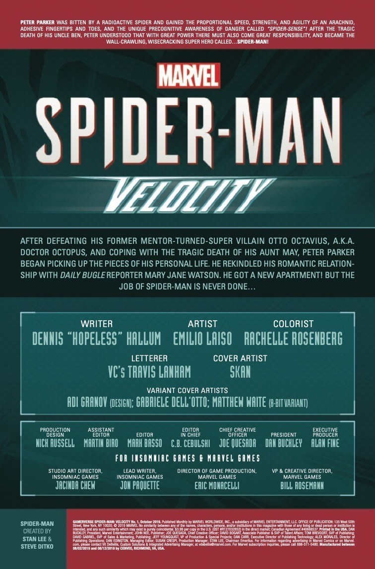 THE FIRST ALL-ORIGINAL STORY SET IN THE GAMERVERSE STARTS HERE! Dennis “Hopeless” Hallum continues the saga of the spectacular SPIDER-MAN with an ALL-NEW story set in the Gamerverse! How and why did PETER PARKER build the armored VELOCITY SUIT seen in the Marvel’s Spider-Man video game? Find out here! After the events of CITY AT WAR, SPIDER-MAN continues to balance his colliding worlds as he attempts to protect New York City against super villains like SWARM, while reporter MARY JANE WATSON delves deep into an investigation with legendary Daily Bugle journalist BEN URICH. Learn the never-before-told backstory behind the popular VELOCITY SUIT as unexplainable occurrences bedevil the city and our heroes come face-to-face with…a poltergeist?! Illustrated by Emilio Laiso (CHAMPIONS, STAR WARS: DOCTOR APHRA), with eye-popping covers by the inimitable SKAN, you won’t want to miss a panel of the first all-original story following up the worldwide hit video game!