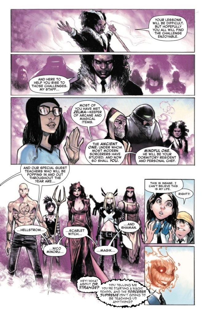 The Marvel Universe has mysteriously changed in such an alarming way that Doctor Strange has done what he’s avoided for decades; he’s opened a school for young sorcerers. Young people from around the world with aptitude in magic have been brought together in New Orleans to study the Mystic Arts under Strange, Brother Voodoo, the Ancient One, the Scarlet Witch, Magik, Hellstrom and ALL your favorite Marvel magicians. But with all the new magical threats, is it too late?!
