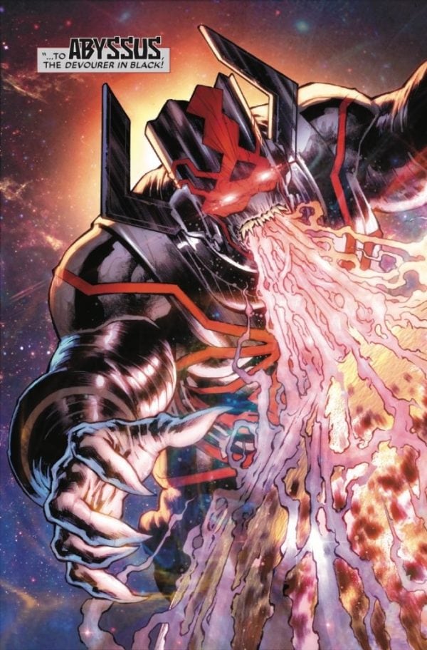 ONE FUTURE ENDS… ANOTHER BEGINS. 3099! From the ashes of the AGE OF HEROES, a new generation of vigilantes, like SPIDER-MAN 2099, NOVA 2099 and RED HULK 2099, emerged in the dystopia that followed to forge a bright, new future — a future that has come to an end in the face of ABYSSYUS, a horrifying fusion of a KNULL-INFECTED GALACTUS!