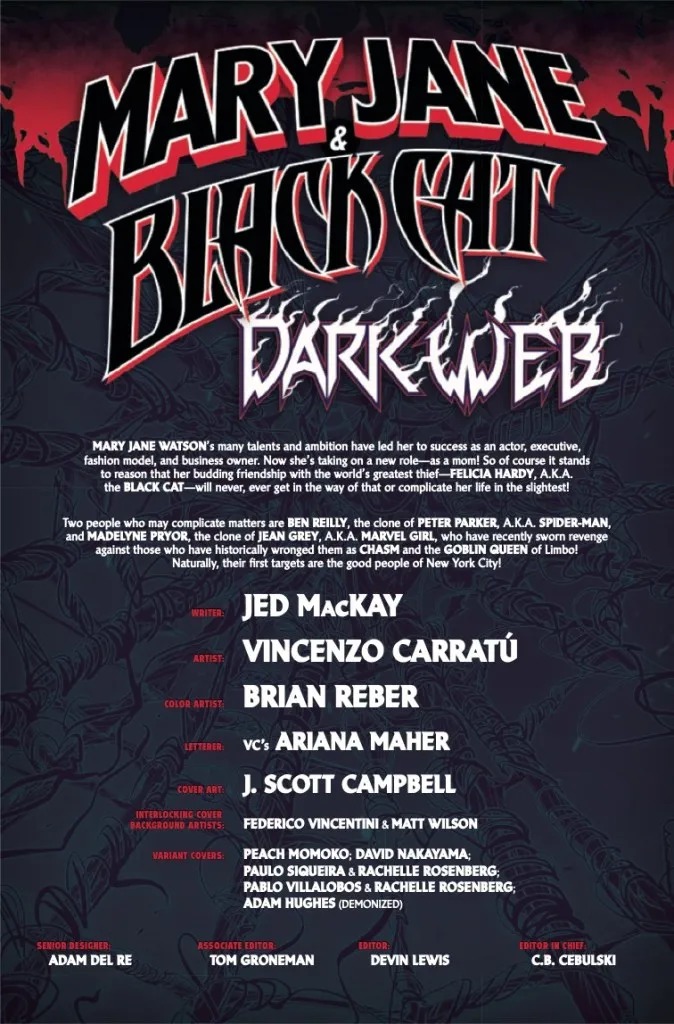 From Jed MacKay (MOON KNIGHT, IRON CAT) and Vincenzo Carratu comes one of the most explosive and kick-ass adventures in Marvel Memory! Set against the explosive backdrop of DARK WEB, Mary Jane Watson and Felicia Hardy find themselves thrown into one another’s paths and then into LIMBO! But SOMETHING HAS CHANGED WITH MJ! And she’s not the only one keeping secret—Felicia’s got a guilty conscience and it’s playing havoc with their escape plan!