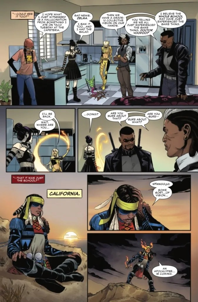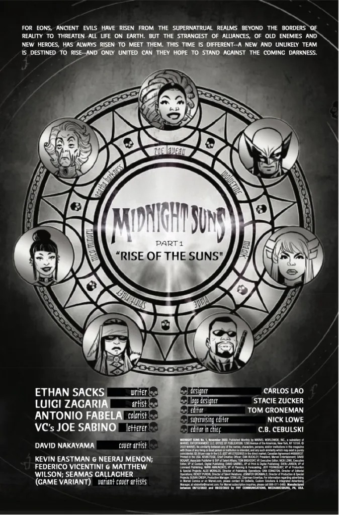 RISE OF THE MIDNIGHT SUNS! A dark prophesy and apocalyptic new villains with horrifying powers the likes of which Earth has never faced before ordains a team of MIDNIGHT SUNS to rise and tear @#$% up: MAGIK, WOLVERINE, BLADE, SPIRIT RIDER & NICO MINORU. But what does this new threat have to do with the Sorcerer Supreme’s past? And why is STRANGE ACADEMY student ZOE LAVEAU number one on the Suns’ list?