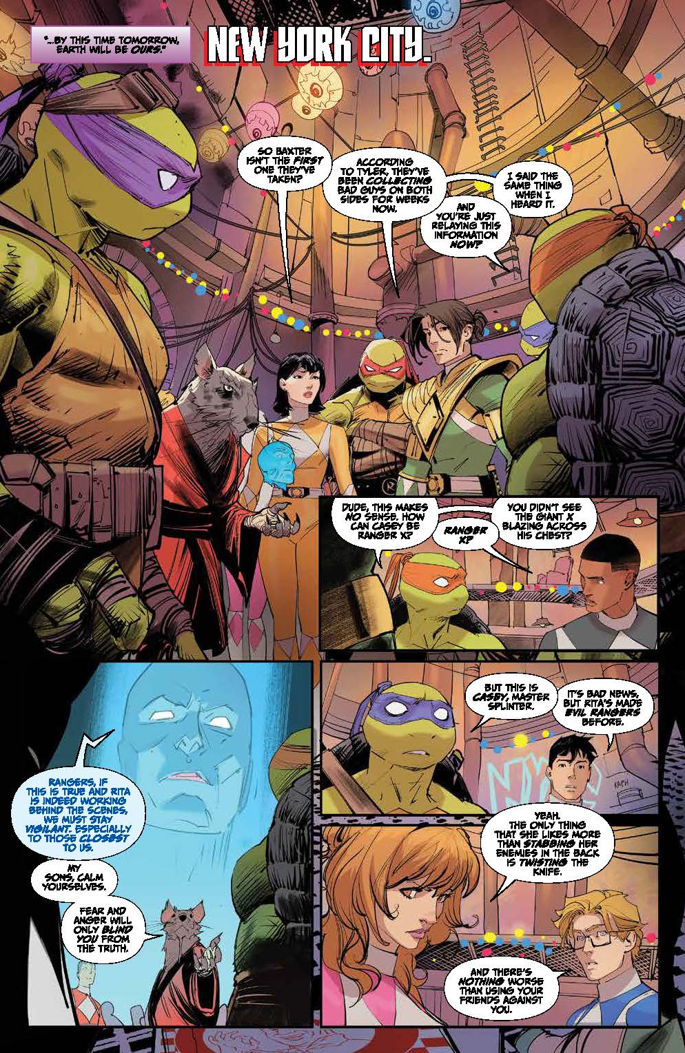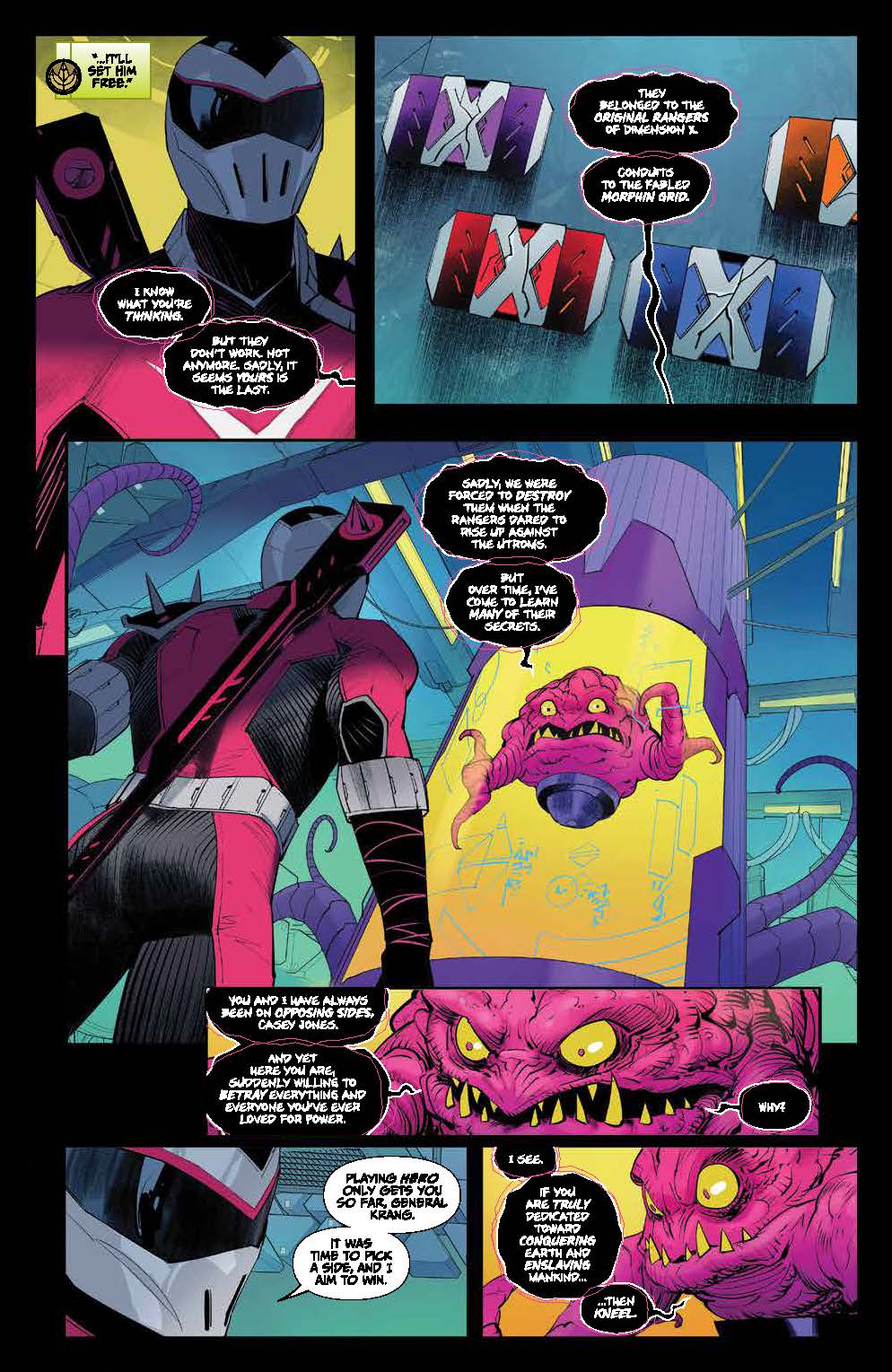 Casey Jones finds himself at odds with his former friends… and allied with Rita Repusla and General Krang! But has his allegiance truly shifted, or is he under some kind of spell–one that the Turtles and the Rangers can break? But our heroes have a lot on their plate: not only do Zordon and Alpha face certain doom, but an invasion threatens all of New York!