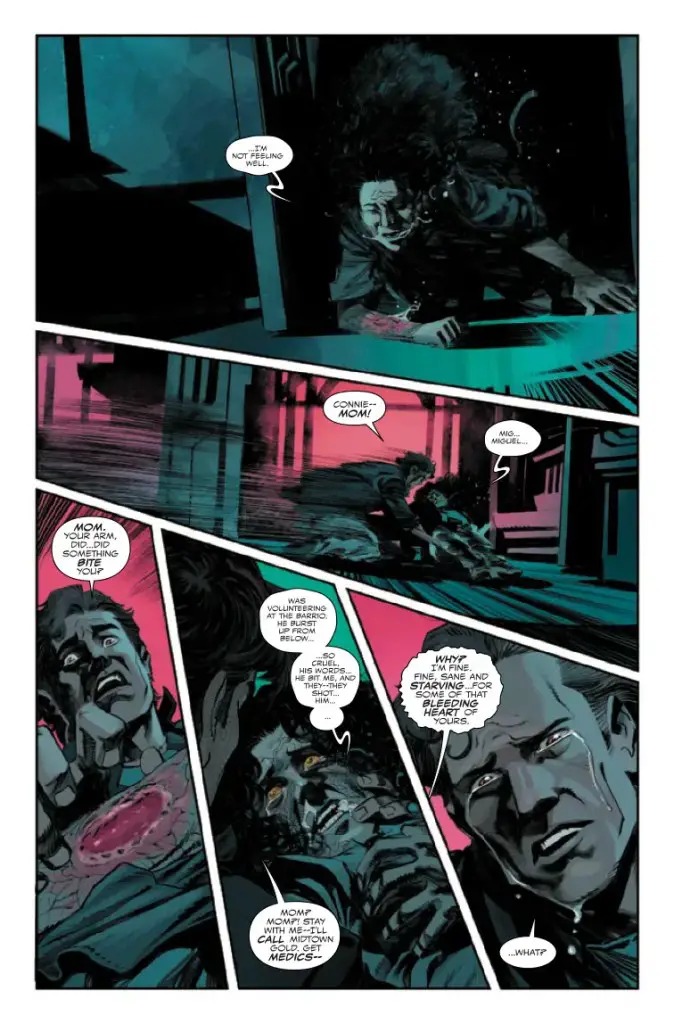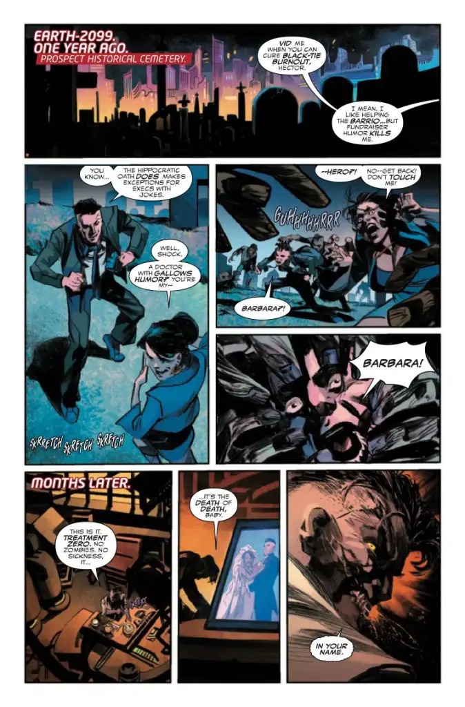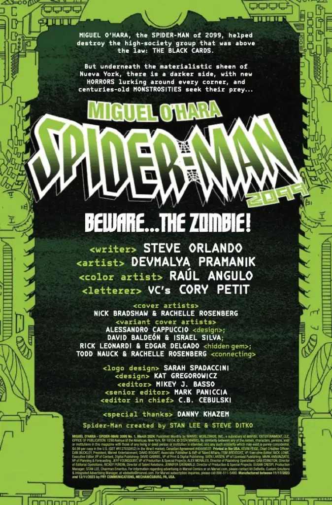BEWARE—MARVEL ZOMBIE: 2099! MIGUEL O’HARA teams up with BLADE 2099 to take on a new horrific threat to NUEVA YORK! Introducing the MARVEL ZOMBIE of 2099! He lives! He strikes! And no spider can hold him! Will SPIDER-MAN be able to stop the ever-evolving zombie infection before it takes hold of his mother and the citizens of the Barrio?