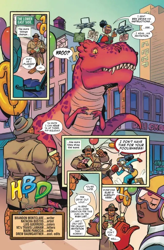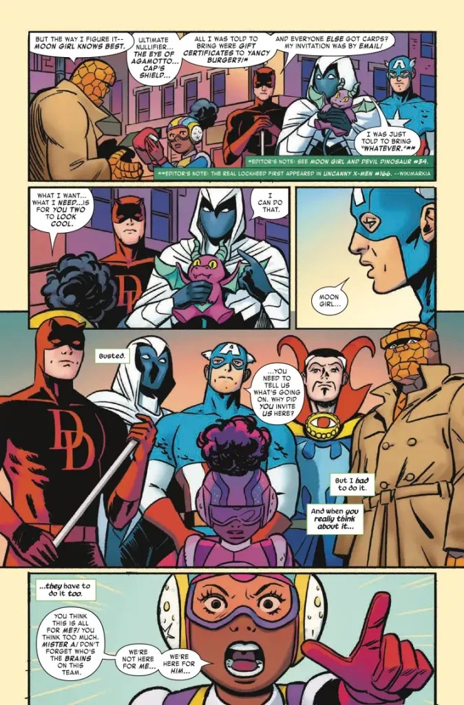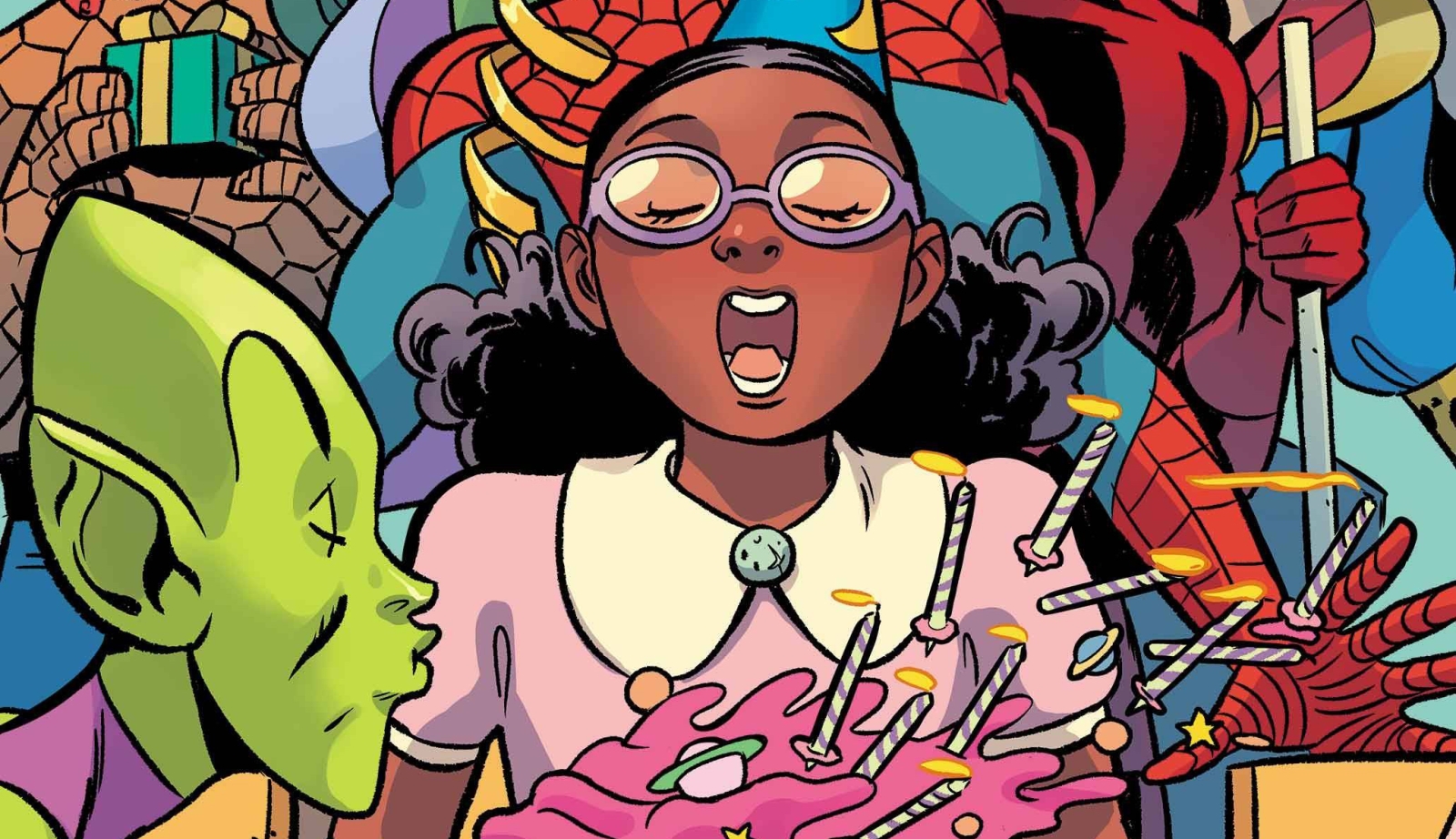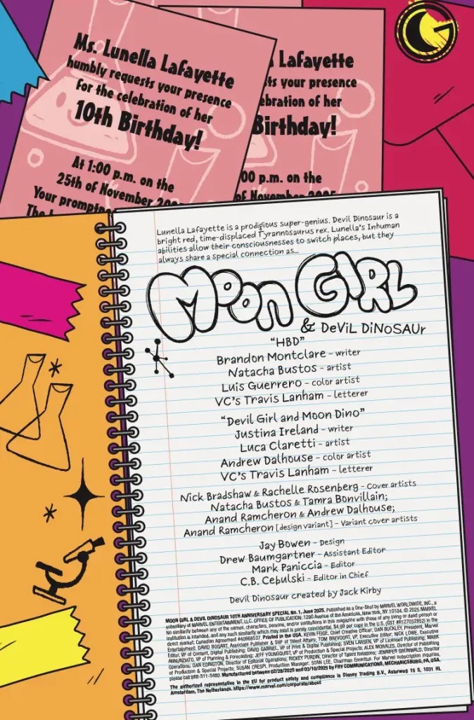 HAPPY 10th BIRTHDAY, LUNELLA! It’s a birthday celebration a decade in the making, and the whole MARVEL UNIVERSE is invited! But MOON GIRL is bringing her own agenda to the party — what could her secret plans be? The mischievous IMPOSSIBLE MAN threatens to upend the festivities — unless LUNELLA can rally her guests the way only the SMARTEST PERSON IN THE MARVEL U can! PLUS: Who is DEVIL GIRL AND MOON DINO?!