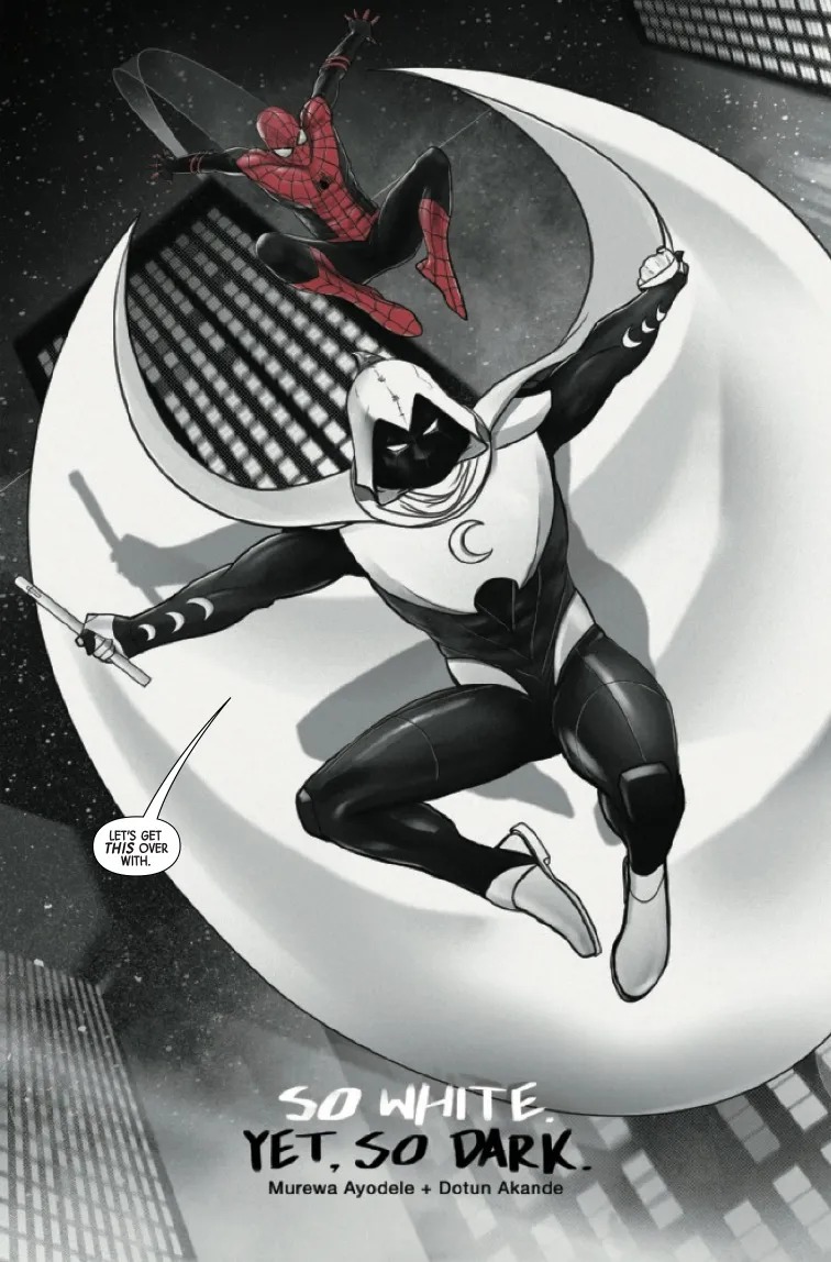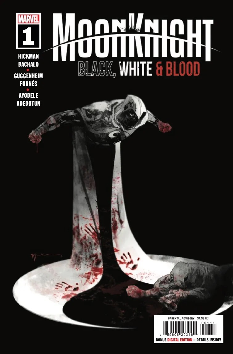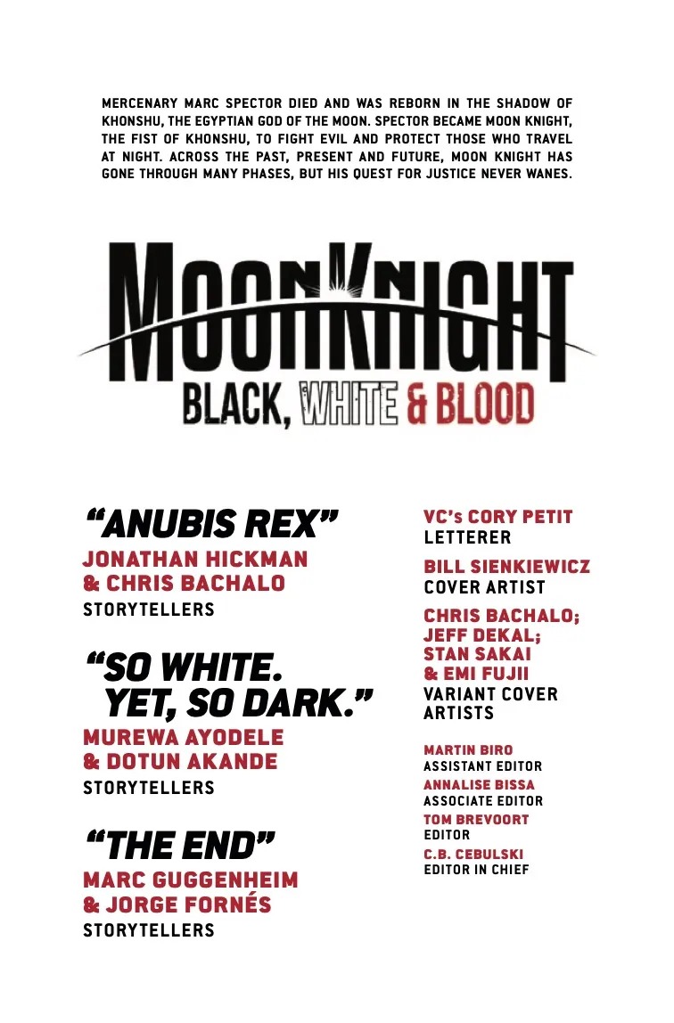 A BLOOD MOON RISES—AND ITS CONTENTS ARE BLACK, WHITE & RED! A bevy of comicdom’s finest creators put their mark upon the Fist of Khonshu in stories depicted in stark black, white and blood-red! Jonathan Hickman and Chris Bachalo introduce the all-different Moon Knight of the future! Marc Guggenheim and Jorge Fornés tell a Moon Knight adventure in reverse! And Murewa Ayodele and Dotun Akande team the white-clad crusader up with the Amazing Spider-Man for a harrowing night of adventure!