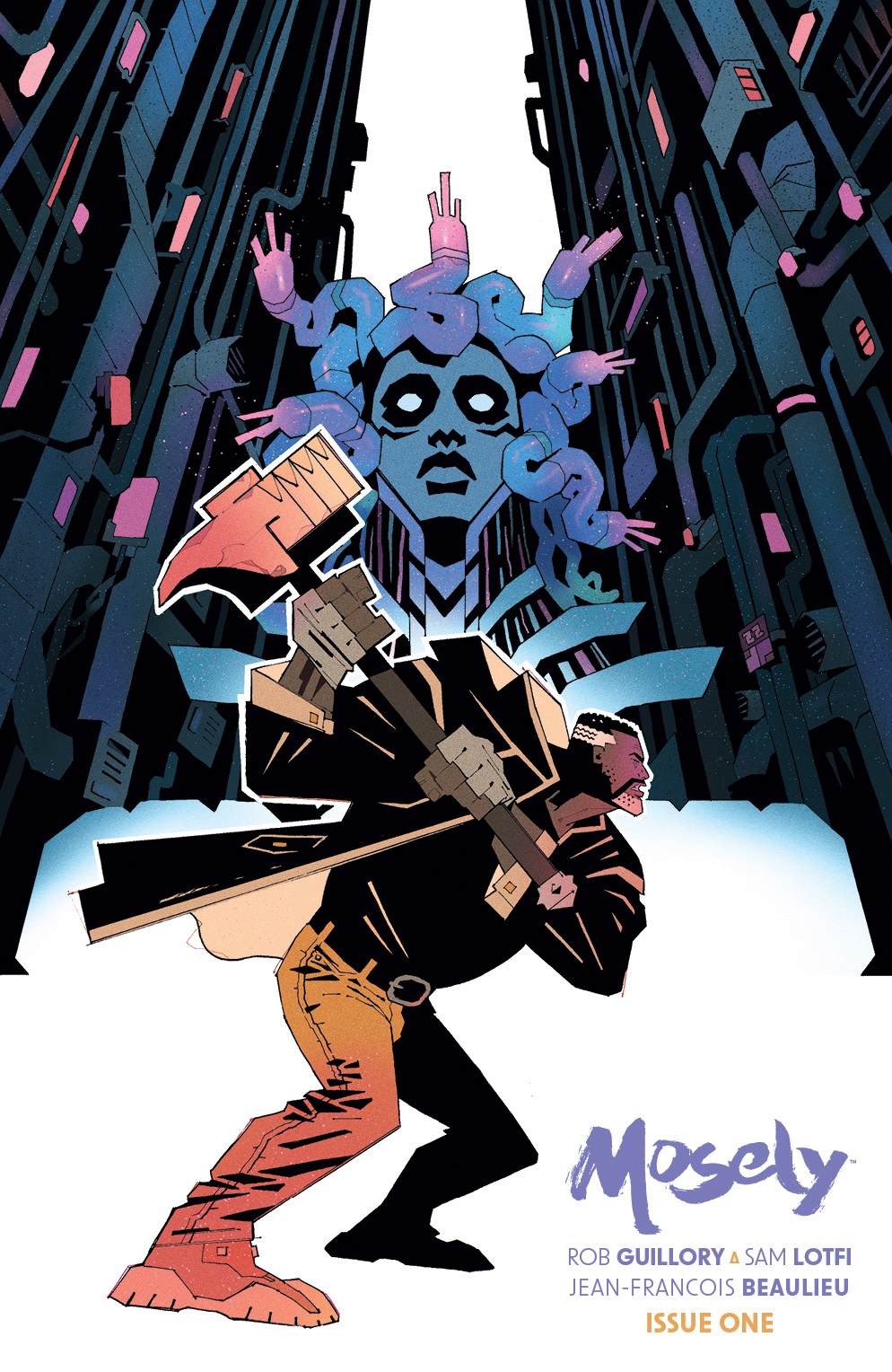 From Farmhand creator Rob Guillory and Sam Lotfi (Harley Quinn), Mosely is a satirical sci-fi blockbuster perfect for fans of God Country and Ghost Cage! In the hyper-technological world of the later 21st century, Mosely is a bitter old janitor on a mission from a higher power—to unleash holy Hell upon the “too big to fail” Tech Gods. Can one man bring down the corporate powers who’ve used their vast influence to oppress an all too complacent human race (and hopefully win back the favor of his estranged family while he’s at it)? Mosely’s taking up the Holy Hammer and you better believe he’s gonna smash some $h!t until he sets mankind free!
