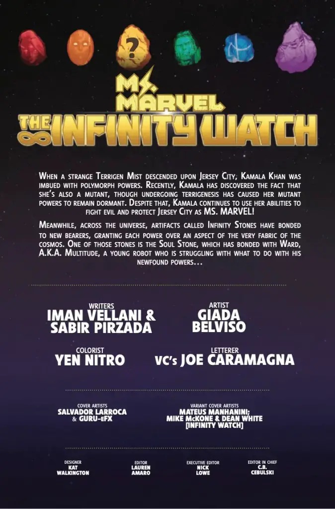 Hero or Villain? That’s the question Multitude must answer as he stands at the crossroads of his own destiny, bonded to one of the Infinity Stones and brimming with power but no purpose. Will a run-in with Ms. Marvel be enough to tip the scales toward good, or will Multitude’s guilt drag him down? Don’t miss out as the Marvel Universe-shaking saga continues here, True Believers! PLUS, Derek Landy and Sara Pichelli bring NICK FURY into the story. But what ties him to the INFINITY WATCH?!