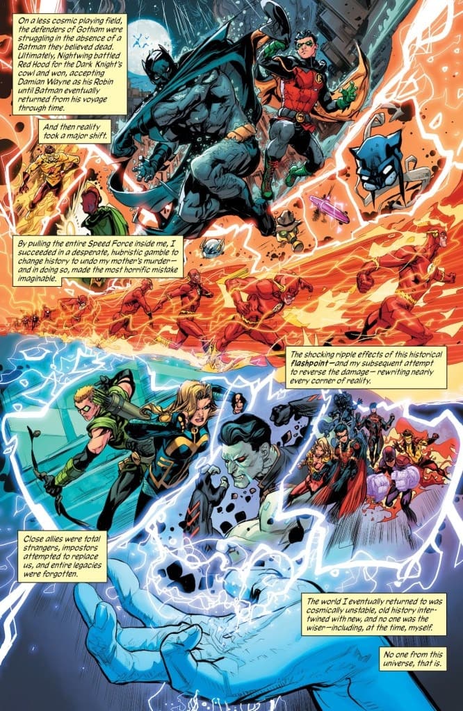 Barry Allen’s documentation of the history of the DC Universe reaches the present day, beginning with the world-changing events of Flashpoint. Heroes face new threats like Perpetua and the Batman Who Laughs, and the next generation of heroes, like Jon Kent, Wallace West, and Jackson Hyde, begin to emerge from the ashes of crisis-level destruction. All leads to Darkseid’s death and a glimpse at what’s to come in the future. You won’t want to miss this final installment!