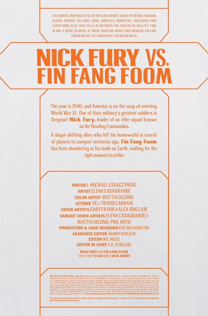 THE HOWLING COMMANDOS TAKE ON FIN FANG FOOM! NICK FURY knows how to handle problems, no matter the size – but he’s never faced a foe THIS big before! Witness the next chapter in J. MICHAEL STRACZYNSKI’s team-up event as he is joined by Marvel Stormbreaker ELENA CASAGRANDE to bring you one of the most wild pairings in Marvel History!