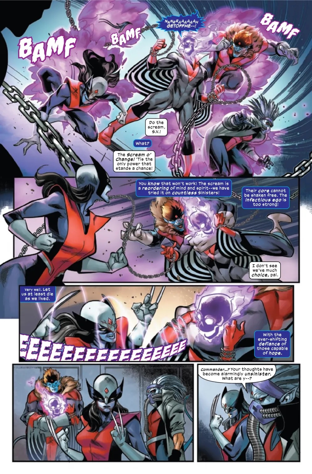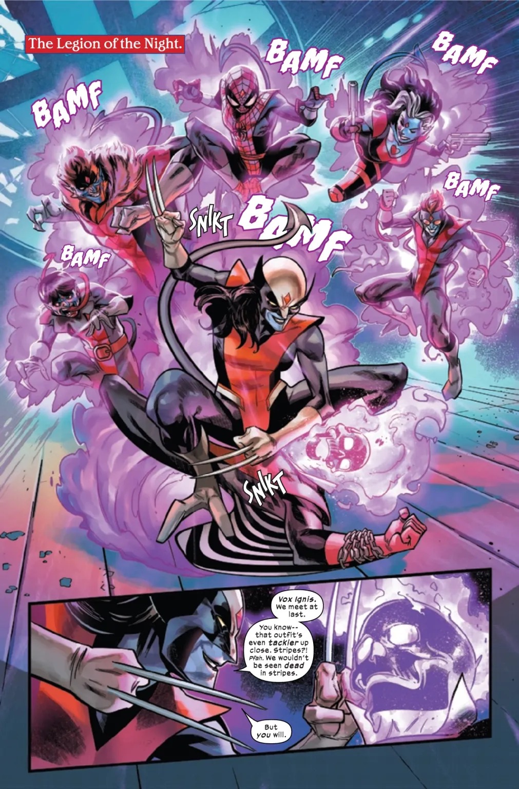 SINISTER’S PRIVATE ASSASSINS! Ten years into a twisted future, MR SINISTER unleashes his private army of assassins: THE LEGION OF THE NIGHT. Meet WAGNERINE, commanding this killer crew of brainwashed hybrids, each one a genetic mix of NIGHTCRAWLER and another one of Marvel’s most murderous mutants! Mysterious forces seek to break Sinister’s control over these fatal fanatics – to turn them AGAINST HIM. But who are they? And what are their true motives…? Enter MOTHER RIGHTEOUS… and a meeting of the most powerful players in the Universe…