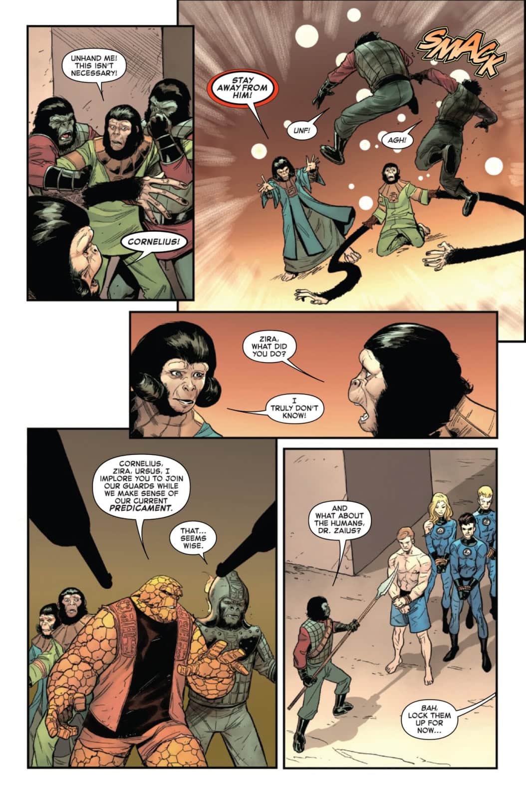CHAOS ON THE PLANET OF THE APES! Dr. Zira, Cornelius, Dr. Zaius and General Ursus now have the cosmic powers of the Fantastic Four! Can Reed, Sue, Ben and Johnny survive long enough to get their abilities back, or will they be stranded on this hostile world forever?