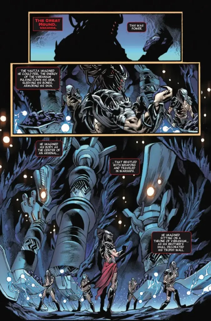PREDATORS GAIN ONE OF EARTH’S DEADLIEST RESOURCES! The Great Mound falls to the invasion! Vibranium is finally within reach of the Predator invaders. But the would-be conquerors are divided… and Wakanda knows better than most what that will do to a nation. If Shuri and T’Challa don’t find a way to stop the rival Yautja clans, Wakanda will be collateral damage in a battle that began on distant stars… and the war won’t stop there.