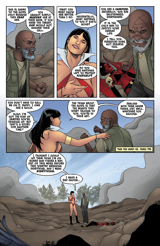 No more running. No more hiding. It’s time to fight, naked beast-style. It’s the fight(s) of the century! Asim Darwish vs Vampirella! Evil Ernie vs. Pantha! Nyx and Draculina vs Lilith! Purgatori vs…Purgatori? Let’s call this one “Scarred in the Garden.” No, wait – “Poke Out My Eyes in Paradise.” No, no. How about: “Purgatori Must Die: Bleedin’ in Eden!” Whatever we end up calling it, you know this one’s going to be wild!