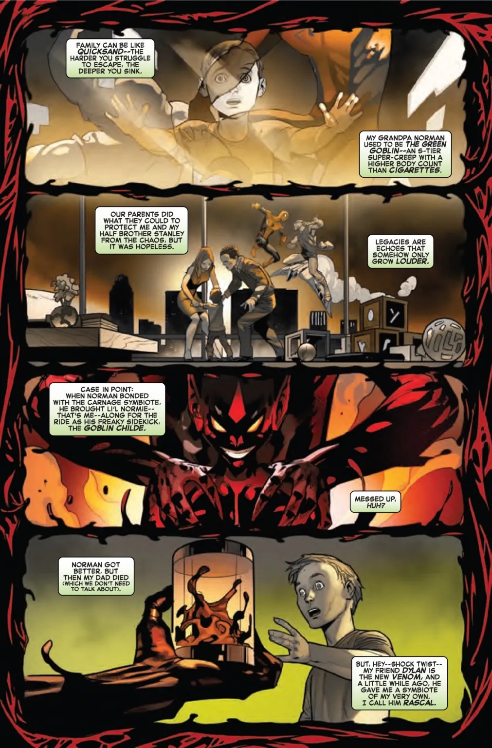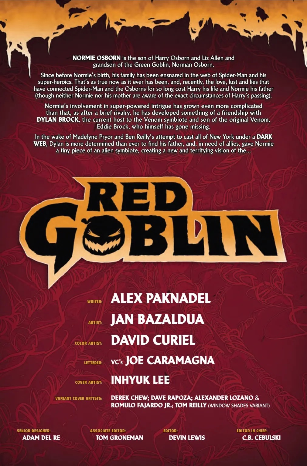 THE NEWEST – AND DEADLIEST – RED GOBLIN! SPINNING OUT OF THE PAGES OF VENOM! Normie Osborn receives his own symbiote at last! As a new Red Goblin, will Normie fulfill his destiny as an Osborn – or will he and his symbiote be able to make a difference for the better?