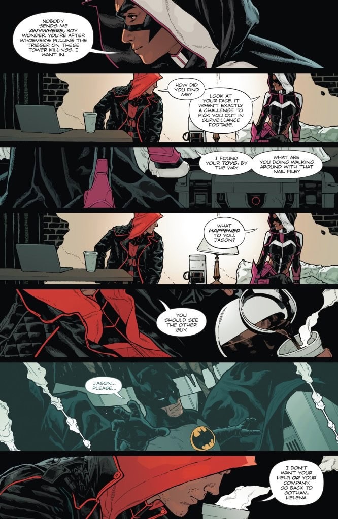 Jason Todd has left Gotham and Batman behind him. All he’s taking with him is his costume, his bike, and a metal briefcase containing two handguns (and lots of bullets). New Angelique seems like the perfect place for Red Hood to put down roots. There’s crime, vice, and corruption everywhere. When Jason discovers a superpowered serial killer who is targeting the city’s police, he finds himself sucked into a terrible and bleak conspiracy with seemingly no end in sight. But Jason isn’t the only person on the scene. Following his trail is Helena Bertinelli a.k.a. Huntress. Is she here to stop him or help him? What will happen when the two black sheep of the Bat-Family start working together? Get ready for Red Hood like you’ve always wanted to see him.