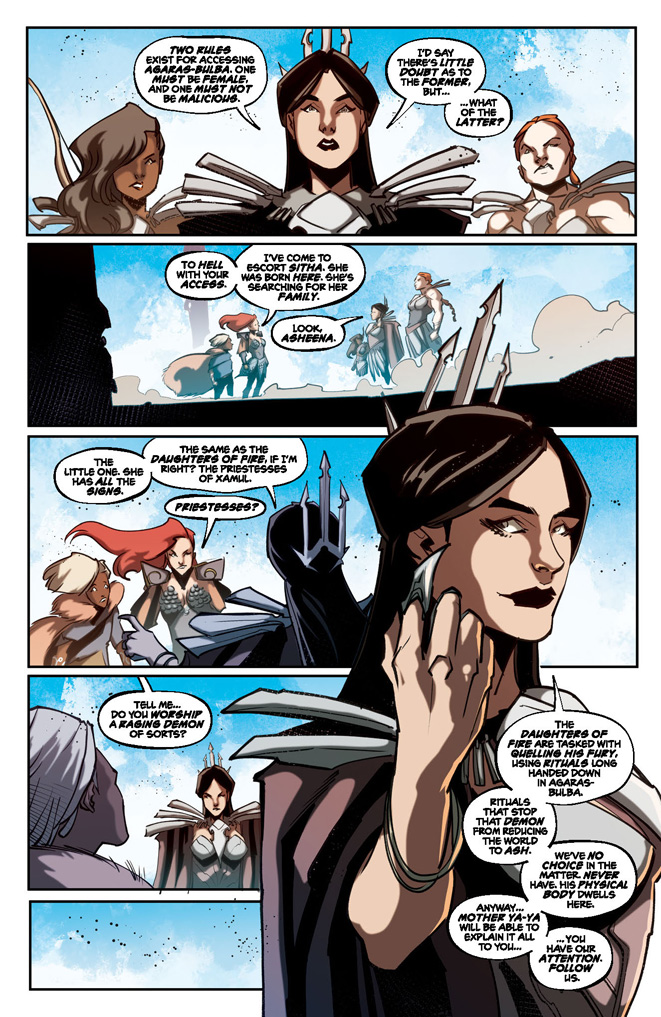 Sitha has finally embraced her real mother once more. With her mission accomplished at last, Red Sonja is ready to go home…but then, why do her instincts tell her that danger still lurks? Sonja will discover that in this village, nothing is really what it seems.