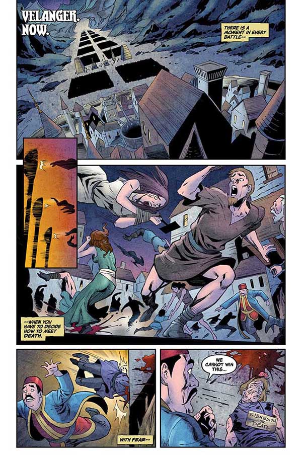 In Part Four of “His Master’s Voice,” the battle is met — and it is fierce and bloody! No stranger to the carnage of war, Red Sonja stands with the defenders at the battlements as Thord Varg presses his forces to destroy the She-Devil With a Sword — and every living soul around her. But cruel as he is, Varg’s malevolence pales in comparison to the forces of evil that are waiting in the wings!