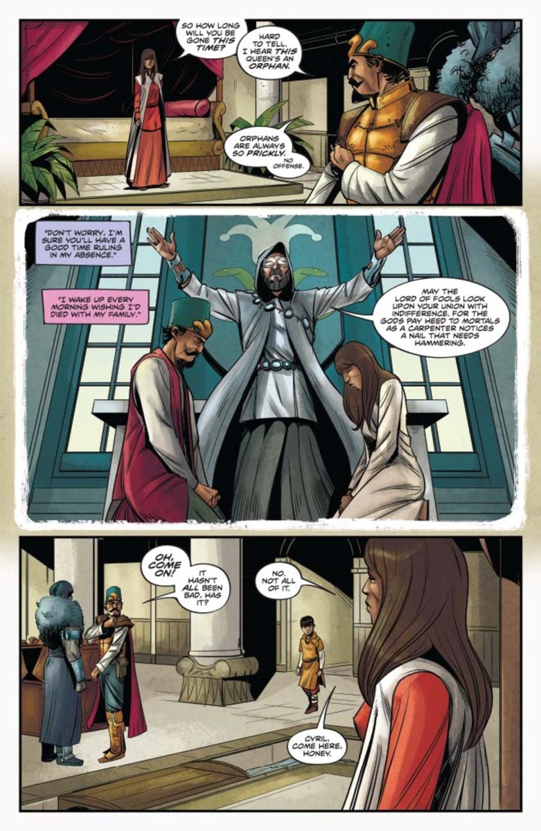 THIRTY pages of story, tying directly into the aftermath of RED SONJA #6! As the battle wages in Hyrkania…CYRIL is the Crown Prince of the Zamoran Empire, and he is young but not stupid. The mysterious blind priest will unlock the secrets of The Lord Of Fools…Cyril will learn his fate, and what it will mean for the known world…