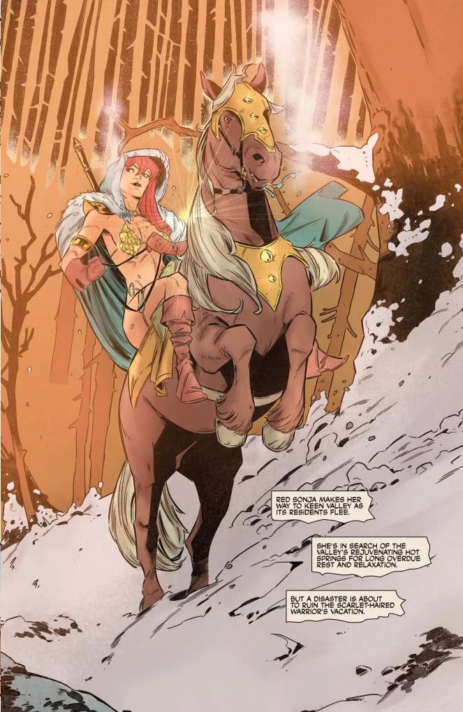 “BURNING LOVE! Red Sonja’s temporarily developed fire powers… which is handy, since she’s in a land where warlords possess deadly ice powers.