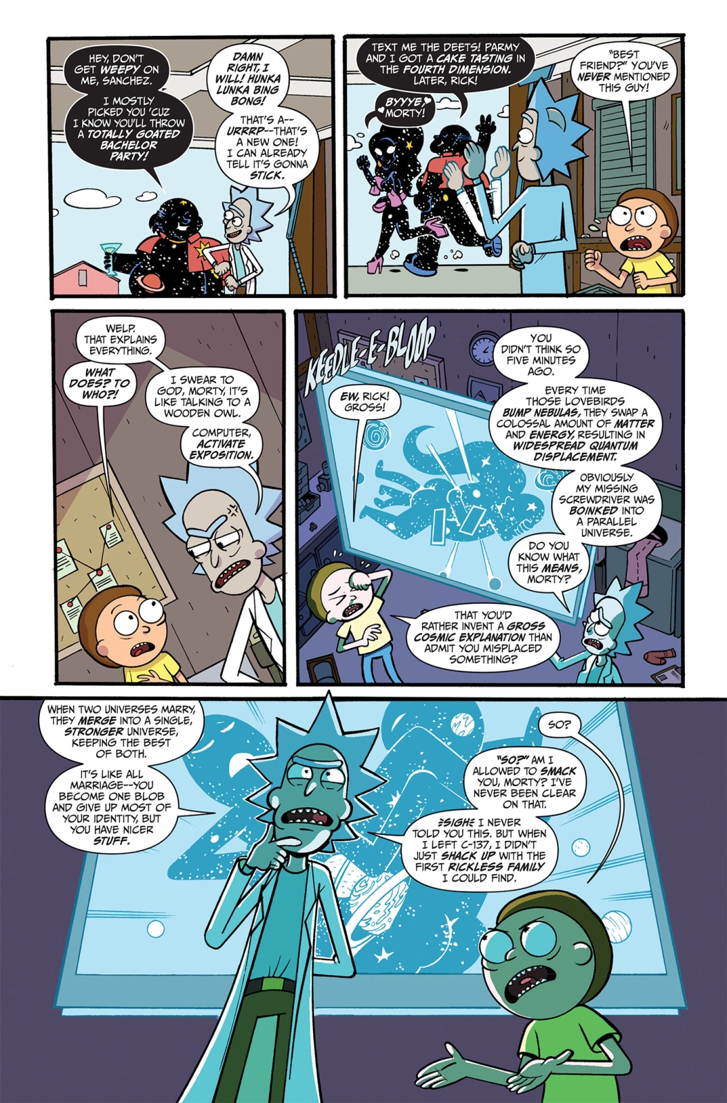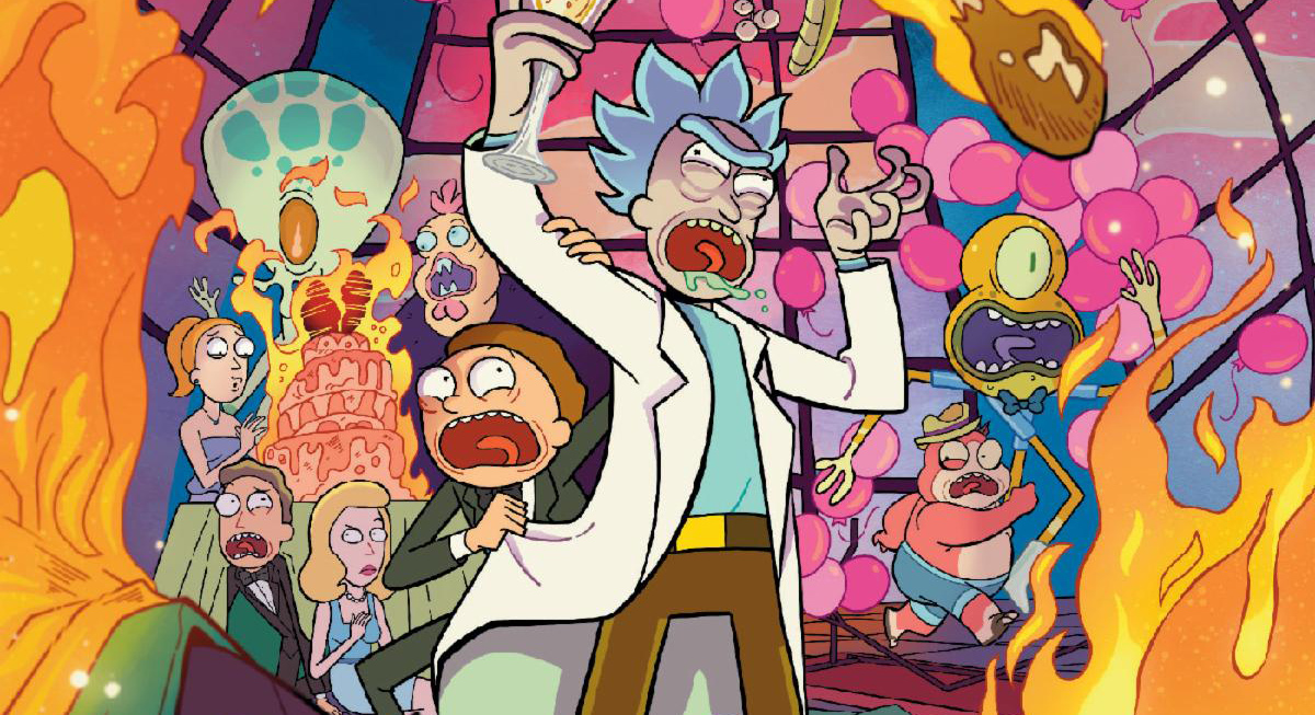 Rick’s old buddy Universe Prime (where Rick and Morty Cronenberg’d Earth) has reached his UNIVERSAL HALF-LIFE and is getting MARRIED—to the female-presenting embodiment of the Parmesan Dimension! (Where they currently live!)  He’s found true love and wants his old pal Rick to plan his bachelor party! WHAT COULD GO WRONG? Answer: Pretty much everything . . . and it is all Rick’s fault! Now Rick and Morty are on the run from EVERY SINGLE UNIVERSE THEY’VE EVER MESSED WITH—meaning, no matter what dimension they escape to, the universe will literally be against them. And, to survive, Rick will be forced to do something he hoped he would never have to do—a last resort of EPIC PROPORTIONS!